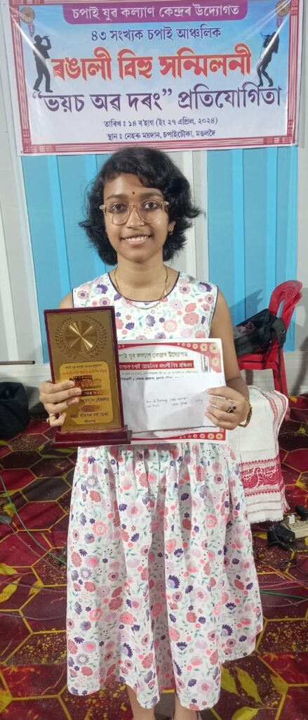 অনাতাঁৰ শিল্পী ৰেণু শইকীয়া, ভাৰতী চহৰীয়া আৰু কাকুল চলিহাই বিচাৰক হিচাপে উপস্থিত থকা এই প্ৰতিযোগিতাত আভিৰি নয়না দাসে দ্বিতীয় স্থান লাভ কৰি চন্দ্ৰপ্ৰভা চৌধুৰী সোঁৱৰণী বঁটা আৰু নগদ চাৰি হাজাৰ পাঁচশ টকা, তৃতীয় স্থানপ্ৰাপ্ত নিতুল ডেকাই বিদ্যাৰাম চহৰীয়া সোঁৱৰণী বঁটা আৰু নগদ তিনি হাজাৰ পাঁচশ টকা, চতুৰ্থ স্থানপ্ৰাপ্ত প্ৰণামী বৰ্মণে জোনমণি বৰুৱা সোঁৱৰণী বঁটা আৰু নগদ তিনি হাজাৰ টকা আৰু পঞ্চম স্থানপ্ৰাপ্ত ৰাগিনী চহৰীয়াই জাতীয় ছহিদ হৰিনাথ নাথ সোঁৱৰণী বঁটা আৰু দুহেজাৰ পাঁচশ টকা লাভ কৰে। আনহাতে তিতিক্ষা শৰ্মাই ষষ্ঠ, জোনাক নিবিড় কাশ্যপে সপ্তম, চোহেব চাবিৰ আহমেদে অষ্টম, নিবিড় কুমাৰ নাথে নৱম, অন্তৰীপ শিৱমে দশম আৰু মোজাহিদুল হকে একাদশ স্থান লাভ কৰি বঁটা আৰু নগদ পাঁচশ টকাকৈ লাভ কৰে। আনহাতে চিত্ৰশিল্পী মৃত্যুঞ্জয় কুমাৰ দেৱ শৰ্মাই উদ্বোধন কৰা আৰু পংকজ চহৰীয়া, বিপুল চন্দ্ৰ ডেকা, অনিৰুদ্ধ ৰাভাই পৰিচালনা কৰা চিত্ৰাংকন প্ৰতিযোগিতাৰ ‘ক’ শাখাত মহাশ্বেতা দত্ত প্ৰথম, হিয়ান ৰয় দ্বিতীয়, বিভান্ত চহৰীয়া তৃতীয় আৰু ধ্ৰুৱিকা চাংকাকতি নিচুকণি বঁটা; ‘খ’ শাখাত ৰিচাংক বৰুৱা প্ৰথম, ৰাজদীপ চন্দ্ৰ ডেকা দ্বিতীয়, দীক্ষিতা শৰ্মা তৃতীয় আৰু স্নিগ্ধা দে নিচুকণি বঁটা; ‘গ’ শাখাত অপৰাজিতা দত্ত প্ৰথম, নিলাক্ষী ডেকা দ্বিতীয়, কৰণ তালুকদাৰ তৃতীয়; ‘ঘ শাখাত মেঘনা দেৱী প্ৰথম আৰু আলিছা ৰহমানে দ্বিতীয় স্থান লাভ কৰে।