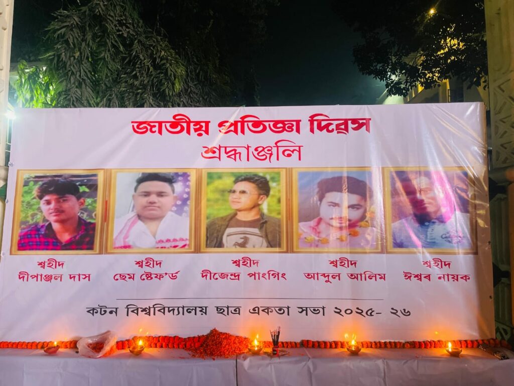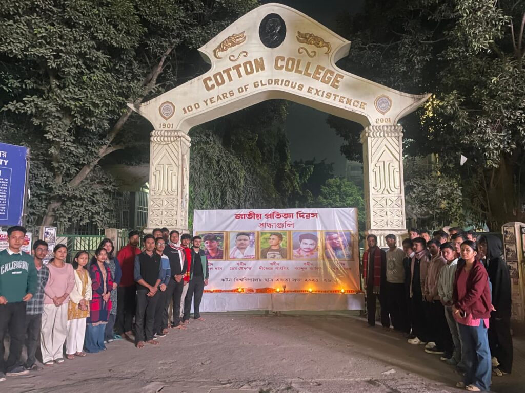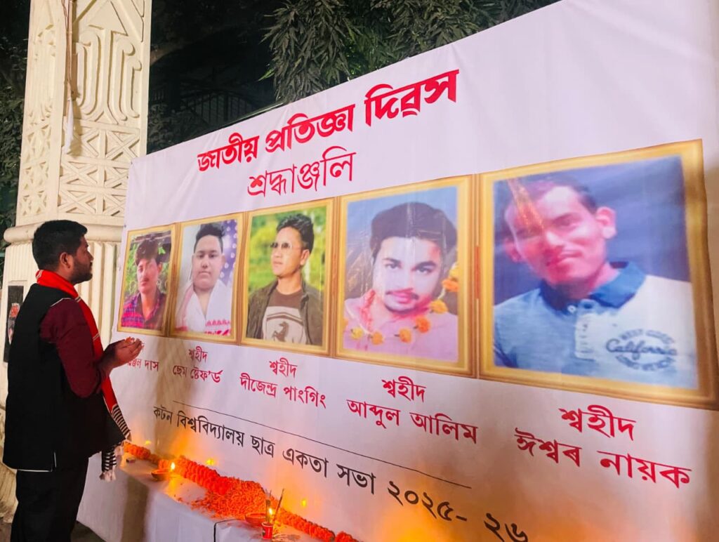 উপস্থিত কটনিয়ানে পঞ্চ ছহিদলৈ শ্ৰদ্ধাঞ্জলি জ্ঞাপন কৰে। অনুষ্ঠানত শেষত কটন বিশ্ববিদ্যালয় আছু গোটৰ সাধাৰণ সম্পাদক কুলদীপ গৌতম শৰ্মাই ‘কা’ৰ গইনাৰে বিদেশী লোকৰ সংখ্যা বৃদ্ধি পালে অসমীয়া ভাষা, সংস্কৃতি আৰু জাতিগত পৰিচয়ৰ প্ৰতি সংকট অহাটো স্বাভাৱিক বুলি উল্লেখ কৰি অসম চুক্তি মতে ২৪ মাৰ্চ ১৯৭১ৰ পাছত সকলো বিদেশীক চিনাক্ত কৰি ব্যৱস্থা গ্ৰহণৰ কৰা কথা উল্লেখ কৰে।’কা’ অসমে নামানে বুলি স্পষ্টভাৱে উল্লেখ কৰে কটন বিশ্ববিদ্যালয় আছু গোটৰ সাধাৰণ সম্পাদক কুলদীপ গৌতম শৰ্মাই। প্ৰতিবছৰে কটন বিশ্ববিদ্যালয় আছু গোটে “আমি পাহৰা নাই” শীৰ্ষক পঞ্চ ছহিদৰ শ্ৰদ্ধাঞ্জলি অনুষ্ঠান আৰু কটন বিশ্ববিদ্যালয় ছাত্ৰ একতা সভাই “জাতীয় প্ৰতিজ্ঞা দিৱস” পালনৰ জৰিয়তে কৰিব বুলি কয়।