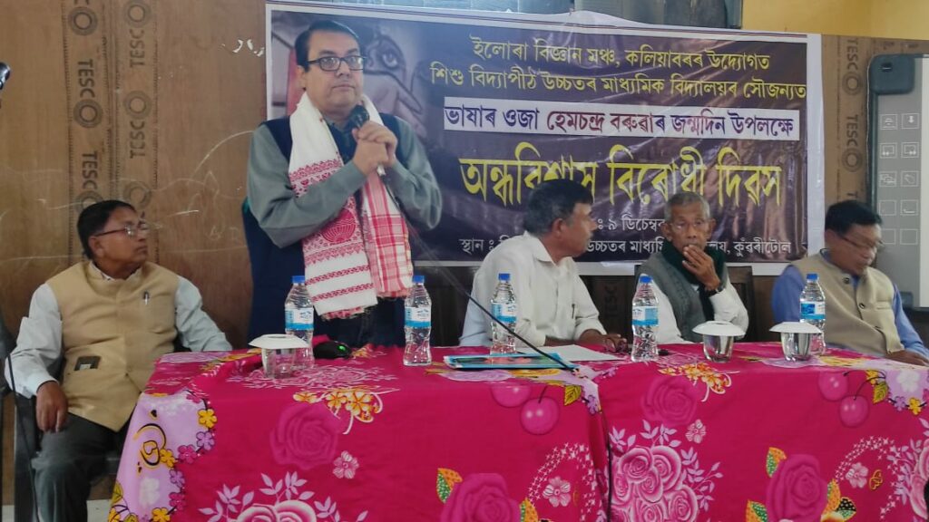 এইগৰাকী সমাজ সংস্কাৰকক জন্মদিনত সোঁৱৰণ কৰি বৰ্তমানৰ সমাজত মানৱতাবাদী ধ্বজাবাহক ৰূপত নতুন প্ৰজন্মক গঢ়ি তুলিবৰ বাবে তেখেতৰ কৰ্মৰাজি মূল্যায়ন আৰু অৱলোকনৰ প্ৰয়োজন হৈ পৰিছে। এনে প্ৰয়োজনৰ প্ৰতি লক্ষ্য ৰাখিয়েই ইলোৰা বিজ্ঞান মঞ্চৰ কলিয়াবৰ শাখাৰ উদ্যোগত কুঁৱৰীটোল শিশু বিদ্যাপীঠ উচ্চতৰ মাধ্যমিক বিদ্যালয়ত ভাষাৰ ওজা হেমচন্দ্ৰ বৰুৱাৰ জন্মদিন উপলক্ষে অন্ধবিশ্বাস বিৰোধী দিৱস আয়োজন কৰে। ভাষাৰ ওজাগৰাকীৰ ১০ ডিচেম্বৰৰ জন্মদিনৰ প্ৰাকক্ষণত কলিয়াবৰ ইলোৰা মঞ্চৰ সভাপতি ভূপেন শৰ্মাৰ সভাপতিত্বত অনুষ্ঠিত হোৱা এই সভাত বিশিষ্ট বক্তা হিচাপে উপস্থিত থাকে তেজপুৰ কেন্দ্ৰীয় বিশ্ববিদ্যালয়ৰ গণিত বিভাগৰ অধ্যাপক ভীমপ্ৰসাদ শৰ্মাই। শৰ্মাই বৰ্তমান সময়তো অন্ধবিশ্বাসৰ কৰাল গ্ৰাসত পৰি ৰোৱা সমাজক বিজ্ঞানমনষ্ক কৰি তোলাত ছাত্ৰ-ছাত্ৰীক আগ্ৰহী হ’বলৈ আহ্বান জনাই। এক মনোগ্ৰাহী উপস্থাপনেৰে উপস্থিত ছাত্ৰ-ছাত্ৰীৰ লগতে সমজুৱাসকলক অন্ধবিশ্বাসৰ সৃষ্টি আৰু ইয়াৰ কু-প্ৰভাৱৰ বিষয়ে অৱগত কৰাৰ লগতে ইয়াৰ পৰিত্ৰাণ বাবে সকলোকে বৈজ্ঞানিক দৃষ্টিভঙ্গীৰে আগ বাঢ়িবলৈ আহ্বান জনায়। এই ক্ষেত্ৰত শিক্ষিত সমাজৰ দায়িত্ব যে অধিক সেই বিষয়েও সচেতনতাৰ প্ৰয়োজনীয়তাৰ ওপৰত গুৰুত্ব আৰোপ কৰে। আজিৰ সভাত কলিয়াবৰ মহাবিদ্যালয়ৰ অধ্যাপক পৰাগ দাহালে ইলোৰা বিজ্ঞান মঞ্চৰ প্ৰতিষ্ঠা আৰু কাৰ্যাৱলীৰ বিষয়ে ব্যাখ্যা কৰাৰ লগতে হেমচন্দ্ৰ বৰুৱাৰ কৰ্মজীৱনৰ বিষয়ে আলোকপাত কৰি কয় – হেমচন্দ্ৰ বৰুৱাই স্বাধীনচিতীয়া আৰু অন্যায়- অবিচাৰৰ হকে কঠোৰ স্থিতি গ্ৰহণ কৰি সমাজৰ কল্যাণৰ হকে উৰ্ছগা কৰিছিল এই জীৱন। সেই সময়ত কানি বৰবিহে ছানি ধৰিছিল অসম। বিধৱা বিবাহৰ কথা কল্পনাই কৰিব নোৱাৰি। ৰক্ষণশীল সমাজত আছিল কেৱল বাধা। তেওঁ সেই সোঁতৰ বিপৰীতে গৈ ৰক্ষণশীল নীতি-নিয়ম ভাঙি মূল্যবোধৰ আধাৰত যুক্তিবাদী আৰু সংস্কাৰমুক্ত এখন সমাজ গঢ়িবলৈ চেষ্টা কৰি সফল হৈছিল। তেওঁ এনে চিন্তাৰ গৰাকী আছিল যে মৃত্যুৰ পাছত তেওঁ নশ্বৰ দেহ ধৰ্মীয় ৰীতি-নীতিৰে শেষকৃত্য সম্পন্ন কৰাৰ সলনি হাবিত পেলাই দিবলৈ কৈ গৈছিল। তাৰ কাৰণ আছিল জীৱ-জন্তুয়ে তেওঁৰ দেহ ভক্ষণ কৰিব। দেহদানৰ এই প্ৰক্ৰিয়া আৰু চিন্তাৰ বীজ তেতিয়াই তেওঁ মনত ৰোপন হৈছিল। এই চিন্তাৰে ইলোৰা বিজ্ঞান মঞ্চয়ে জন্মলগ্নৰে পৰা চিকিৎসা বিজ্ঞানৰ সহায় হোৱাকৈ দেহদানৰ বাবে অসমীয়াৰ মাজত সজাগতাৰ সৃষ্টি কৰি আহিছে। যোৱা ২০০৫ চনৰ পৰা ভাষাবিদ গৰাকীৰ জন্মদিনটো অন্ধবিশ্বাস বিৰোধী দিৱস হিচাপে পালন কৰি আহিছে ইলোৰা বিজ্ঞান মঞ্চই। সভাত ভূপেন শৰ্মাই ঊনবিংশ শতিকাৰ মাজভাগৰ আধুনিক শিক্ষাৰ প্ৰসাৰ নৌহওঁতেই ভাষাৰ ওজাগৰাকীয়ে মই সমাজ সংস্কাৰকৰ ভূমিকা লৈছিল সি আজিৰ আধুনিক শিক্ষিত সম