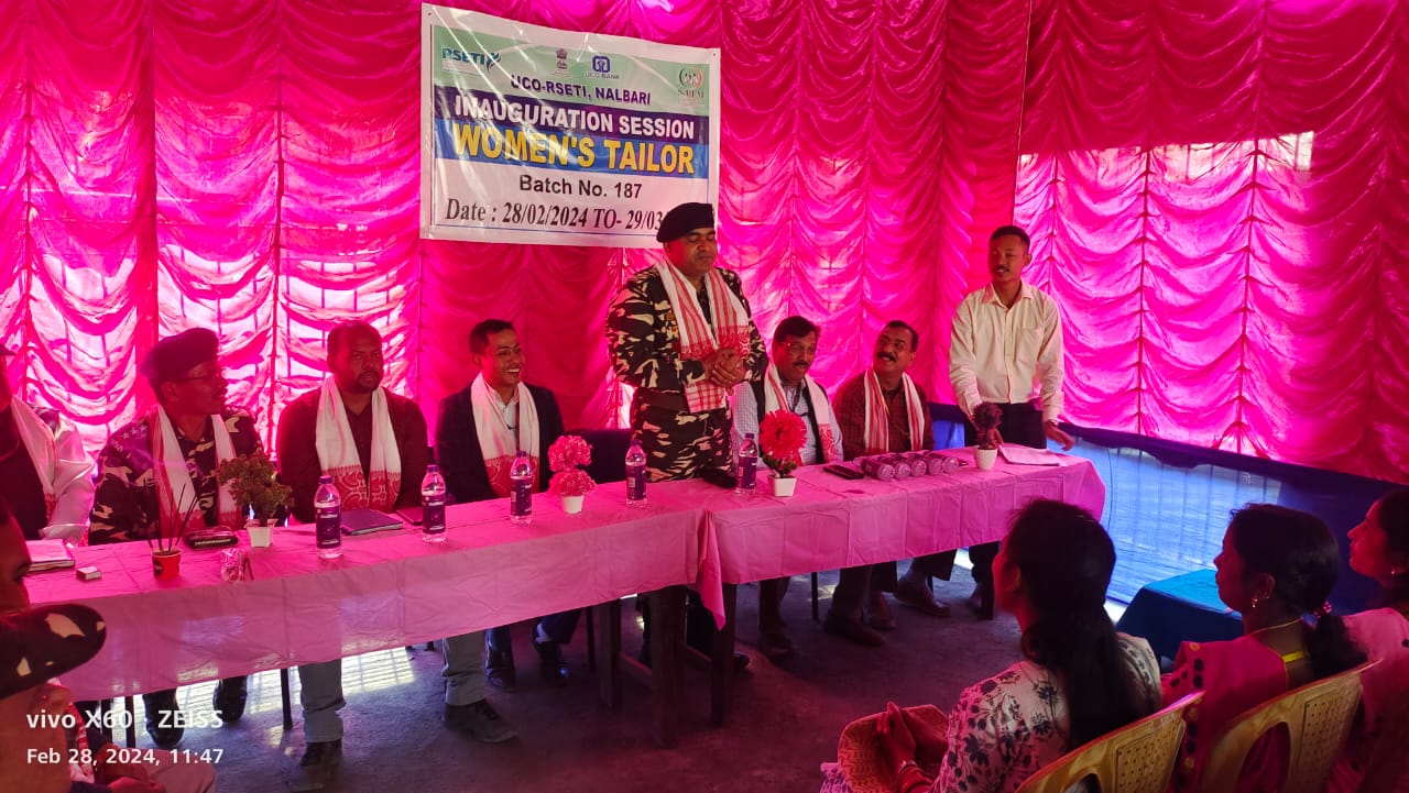The opening ceremony of vocational training on tailoring in coordination with RSETI Nalbari for 35 women under the Civic Action Programme in NE was held today at the RSETI Institute,Paikarkuchi Nalbari.This one month training programme on tailoring for the unemployed women who are under privileged and BPL will continue till 29 March 2024.The opening function commenced with the lightning of the lamp by Sh. Sunil Kaushik,Commandant 1st BN SSB Sonapur followed by a short prayer. Sh. Sarvesh Vijayant,LDM and Sh.