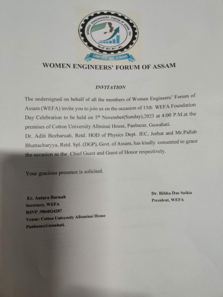 ৰাজ্যৰ মহিলা অভিযন্তা সকলৰ একমাত্ৰ আৰু উমেহতীয়া সংগঠন অসম মহিলা অভিযন্তা সন্থা“ৰ ( Women Engineers Forum of Assam ) পঞ্চদশ প্ৰতিষ্ঠা দিৱস অহা ৫ নৱেম্বৰত কটন বিশ্ববিদ্যালয়ৰ এলামনাই ভৱনৰ প্ৰেক্ষাগৃহত অনুষ্ঠিত হ’ব।