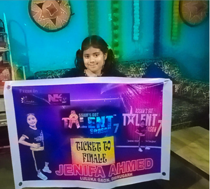 ৰাজ্যিক ভিত্তিত গুৱাহাটীত অনুষ্ঠিত হোৱা আচাম গৌট টেলেণ্ট প্ৰতিযোগিতাত ডিব্ৰুগড়ৰ পৰা অংশগ্ৰহণ কৰি চূড়ান্ত প্ৰতিযোগিতাত স্পাৰ্কলিং পাৰফৰমেন্স খিতাপ অৰ্জন কৰি সমগ্ৰ ৰাজ্যখনৰ লগতে ডিব্ৰুগড়বাসীৰ বাবেও গৌৰৱ কঢ়িয়াই আনিলে লালুকা গাঁওৰ ইলু বেগমৰ ৮ বছৰীয়া কন্যা জেনিফাৰ আহমেদে।
