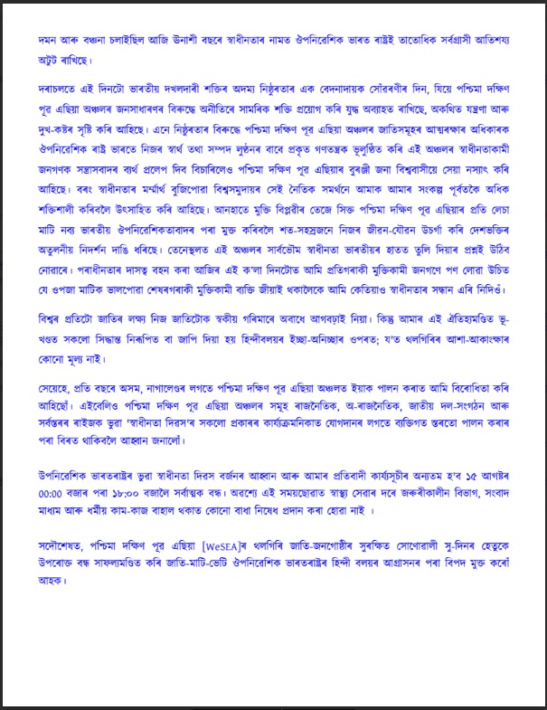 অনুষ্ঠানটোত উপস্থিত থাকে সদৌ শোণিতপুৰ জিলা ছাত্ৰ সন্থাৰ শিক্ষা সম্পাদক শংকৰ দাস। শেহতীয়াকৈ তেওঁ পঞ্চ শ্বহীদৰ প্ৰতি শ্ৰদ্ধা জ্ঞাপন কৰি কেন্দ্ৰীয় আৰু ৰাজ্য চৰকাৰক তীব্ৰ ভাষাৰে সমালোচনা কৰে। তেওঁ স্পষ্টকৈ ক’লে— “কোনো কাৰণে জাতিধ্বংসী নাগৰিকত্ব আইন মানি লোৱা নহয়। অসমীয়াৰ স্বাভিমান আৰু অস্তিত্বৰ প্রশ্নত আপোষ নহয়।”