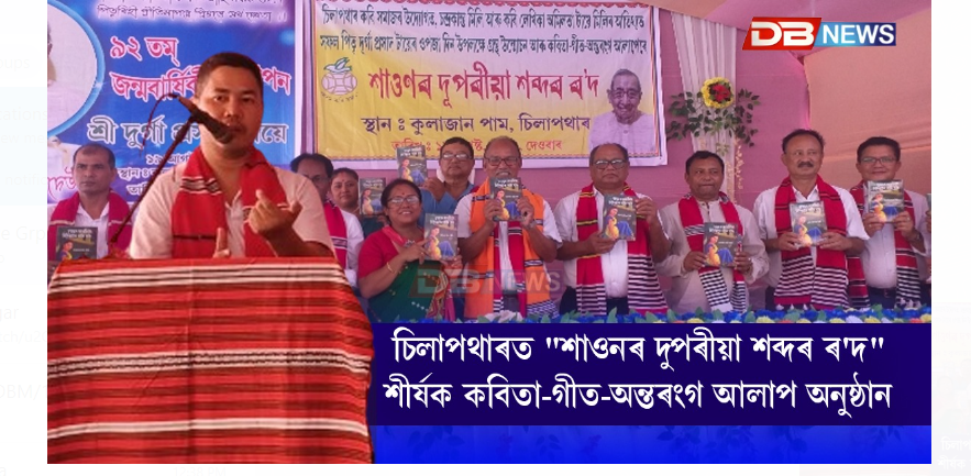 চিলাপথাৰস্হিত নামচুক কুলাজান পামত আজি অনুষ্ঠিত হয় কবিতা-গীত অন্তৰংগ আলাপ অনুষ্ঠানৰ লগতে এখন গ্ৰন্থ উন্মোচনী সভা । চিলাপথাৰ কবি সমাজৰ উদ্যোগত, চন্দ্ৰকান্ত মিলি আৰু অমিলতা টায়ে মিলিৰ আতিথ্যত পিতৃ দুৰ্গা প্ৰসাদ টায়েৰ ৯২ সংখ্যক ওপজা দিন উপলক্ষে অনুষ্ঠিত দেওবাৰে (১৮/০৮/২০২৪) এই অনুষ্ঠানৰ আৰম্ভণিতে পদ্মনাথ টায়ে বন্তি প্ৰজ্বলন কৰাৰ পাছতেই দুৰ্গা প্ৰসাদ টায়েৰ জন্ম দিৱসৰ ওলগ আৰু উদযাপন কৰাৰ পাছতেই অসম কবি সমাজৰ সহকাৰী সম্পাদক ভুবন দাসে আঁতধৰা শ্ৰদ্ধাঞ্জলি অনুষ্ঠানত সদ্যপ্ৰয়াত অসম কবি সমাজৰ প্ৰতিষ্ঠাপক সভাপতি ৰবীন্দ্ৰ বৰাৰ স্মৰণত এক মিনিট সময় মৌন প্ৰাৰ্থনা কৰা হয় । ইয়াৰ পিছতে চিলাপথাৰ কবি সমাজৰ সভাপতি নৃপেন বৰঠাকুৰৰ সভাপতিত্বত অনুষ্ঠিত গ্ৰন্থ উন্মোচনী সভাত চিলাপথাৰ অঞ্চলৰ কবি,