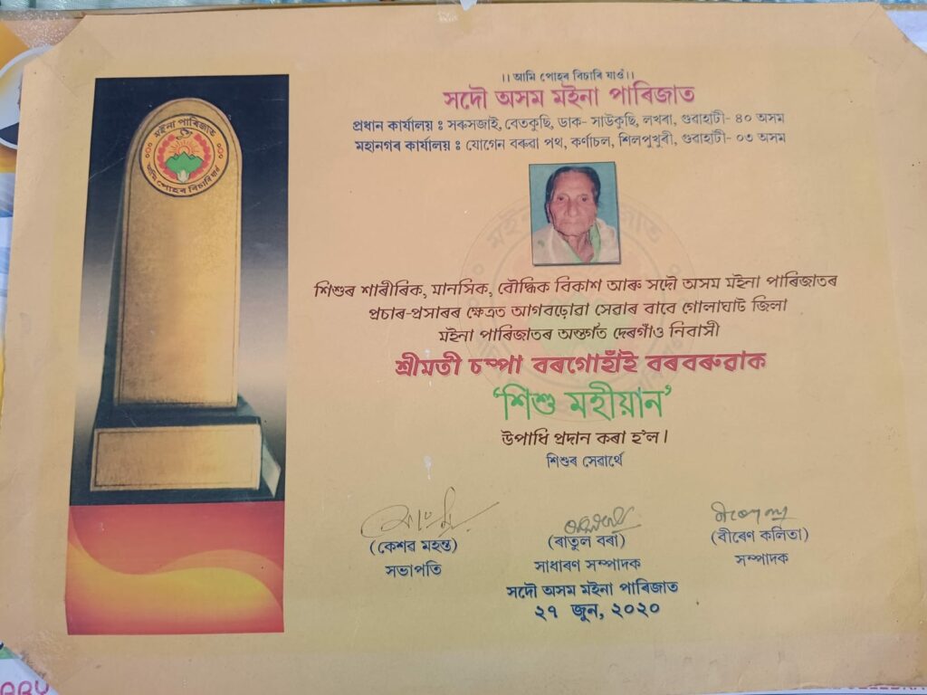 দেৰগাঁৱৰ (Dergaon) এগৰাকী বিশিষ্ট সাংস্কৃতিক কৰ্মী, সদৌ অসম মইনা পাৰিজাতৰ “শিশু মহীয়ান”, সদৌ অসম লেখিকা সমাৰোহ সমিতিৰ “সদস্যাৰত্ন” উপাধি প্ৰাপ্ত জ্যেষ্ঠা নাগৰিক চম্পা বৰগোহাঁই বৰবৰুৱাৰৰ ৯৩ বছৰ বয়সত আজি পুৱা ৬বজাত নিজা বাসগৃহত বাৰ্ধক্যজনীত কাৰণত দেহাৱসান ঘটে।