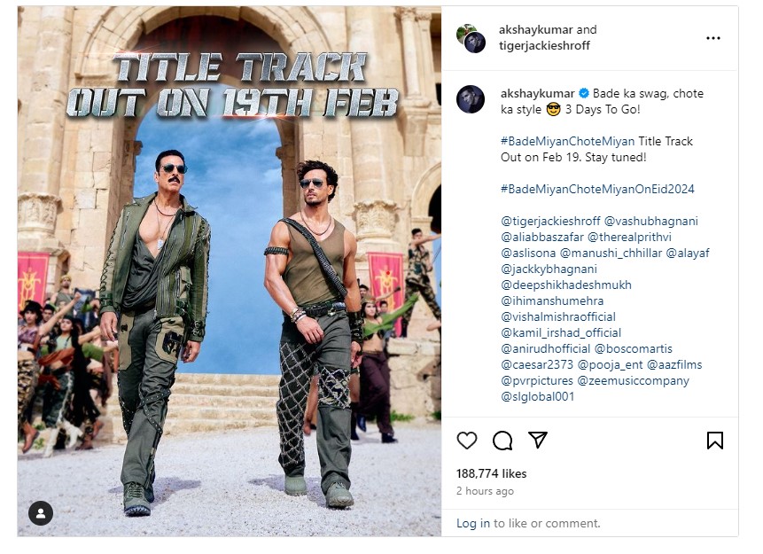 শুকুৰবাৰে অক্ষয়ে ইনষ্টাগ্ৰামত আগন্তুক ট্ৰেকৰ নতুন পোষ্টাৰ শ্বেয়াৰ কৰাৰ লগতে কেপচন দিছিল, “বড়ে কা শ্বেগ, ছোটে কা ষ্টাইল ৩ ডেজ টু গ’! Bade Miyan Chote Miyan টাইটেল ট্ৰেক মুক্তি পাব ১৯ ফেব্ৰুৱাৰীত…!”