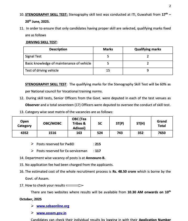 EWSৰ বাবে নাই কোনো সংৰক্ষণৰ ব্যৱস্থা। প্রাক্তন কৰ্মচাৰীৰ বাবে সংৰক্ষিত ১১৭ টা পদ। দিব্যাংগৰ বাবে সংৰক্ষিত ২১৫ টা পদ। SEBAONLINE.ORG আৰু ASSAM.GOV.INত চাব পাৰিব ফলাফল।