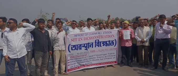 চাপৰ ৰেল যাত্ৰী সন্থাৰ উদ্যোগত যাত্ৰীবাহী ৰেল ৰখাৰ দাবীত এই প্ৰতিবাদ।