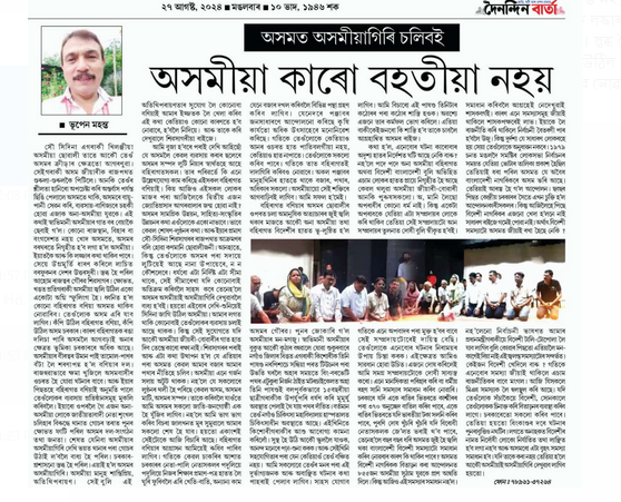 আমি বুজা হ’বৰ পৰাই দেখি আহিছোঁ যে অসমলৈ কেৱল ব্যৱসায় কৰাৰ ছলেৰে অসমৰ সম্পদ লুটি নিয়াৰ স্বাৰ্থতহে আহে বহিৰাগতসকল। তাৰ পৰিৱৰ্তে কি এনে উল্লেখযোগ্য কাম কৰিছে এইসকল বহিৰাগত বণিয়াই। কিয় আজিও এইসকল লোকৰ মাজৰ পৰা আজিলৈকে দ্বিতীয় এজন জ্যোতিপ্ৰসাদ আগৰৱালাৰ জন্ম হোৱা নাই ? অসমৰ সামগ্ৰিক উন্নয়ন, সাহিত্য-সংস্কৃতিৰ উন্নয়নৰ কথা এওঁলোকে একো নাভাবে। ভাবে কেৱল শোষণ-লুণ্ঠনৰ কথা। আৰু ইয়াৰ প্ৰমাণ সৌ-সিদিনা শিৱসাগৰৰ ৰাজপথত আক্ৰমণৰ বলি হোৱা কণমানি ছোৱালীজনী। আনহাতে, কিন্তু তেওঁলোকে অসমৰ পৰা সদায়ে লুটিয়েই আছে নানা উপায়েৰে, ন ন কৌশলেৰে। ধৰ্যৰো এটা নিৰ্দিষ্ট সীমা থাকে, সেই সীমাৰেখা যদি কোনোবাই অতিক্ৰম কৰিবলৈ সাহস কৰে তেনেহ’লে অসমৰ অসমীয়াই অসমীয়াগিৰি দেখুৱাবলৈ বাধ্য হ’বই। হয়তো এইবোৰ দেখি-শুনিয়েই সিদিনা জাগি উঠিল অসমীয়া। আমাৰ লগত থাকি কোনোবাই তেওঁলোকৰ ব্যৱসায় চলাই আছে থাকক। কিন্তু সেই সুযোগতে যদি আকৌ অসমীয়া জীয়ৰী-বোৱাৰীৰ গাত হাত দিব, তেন্তে কাৰো ৰক্ষা নাই। শিৱসাগৰৰ পৰাই আৰু এটা কথা উত্থাপন হ’ল যে এতিয়াৰ পৰা অসমত কেৱল আমাৰ বজাৰ আমাৰ পথাৰ নীতিহে চলিব। অসমীয়াৰ এনে গৰ্জন সদায় অটুট থাকক। নহ’লে যে সকলোৰে লুণ্ঠনৰ থলী হৈ পৰিছে কেৱল অসম, অসমৰ মাটি, অসমৰ সম্পদ। তাকে কৰিবলৈ যাওঁতে আমি অসমৰ সকলো জাতি-জনগোষ্ঠী এক হৈ যুঁজিব লাগিব। নহ’লে আমি ভাগ ভাগ কৰিব বিচৰা জালখনত মূৰ সুমুৱালে আমাৰ সকলো শেষ হৈ যাব। হয়তো একাংশই সেইটোকে আজি বিচাৰি আছে। বহিৰাগত বণিয়াৰ আগ্ৰাসন আমিয়েই ৰুধিব পাৰিব লাগিব। গতিকে কেৱল চাকৰিৰ আশাত চৰকাৰৰ নেতা-পালি নেতাসকলৰ পদূলিয়ে পদূলিয়ে নিজৰ শিক্ষাৰ প্ৰমাণ-পত্ৰ হাতত লৈ ঘূৰি ফুৰিবলৈ এৰি খেতি-বাতি, অন্যান কাম যেনে বজাৰ দখল কৰিবলৈ বিভিন্ন পন্থা গ্ৰহণ কৰিব লাগিব। যেনেদৰে পঞ্জাবৰ জনসাধাৰণে আন্দোলনো কৰিছে কৃষি কাৰ্যতো অধিক উৎসাহেৰে মনোনিৱেশ কৰিছে। গতিকে তেওঁলোকে কেতিয়াও আনৰ ওচৰত হাত পাতিবলগীয়া নহয়, কেতিয়াও হাত নাপাতে। তেওঁলোকে সকলো কৰিব পাৰে। গতিকে তাত বহিৰাগতই দাদাগিৰি কৰিব নোৱাৰে। অকল পঞ্জাবৰ মানুহখিনিৰ হাততে থাকে বজাৰ, পথাৰ, অধিকাৰ সকলোঁ। অসমীয়ায়ো সেই শক্তিৰে আগবাঢ়িবই লাগিব। আমি সফল হ’মেই।