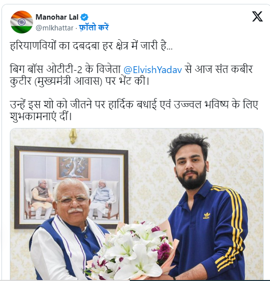 বিজয়ৰ পিছত এলভিছ যাদৱক লগ পাই মুখ্যমন্ত্ৰী মনোহৰ লাল খট্টৰে টুইট কৰি সুখ প্ৰকাশ কৰে। বিগ বছ অ’টিটিৰ বিজয়ী এলভিছ যাদৱে শেহতীয়াকৈ হাৰিয়ানাৰ মুখ্যমন্ত্ৰী মনোহৰ লাল খট্টৰক সাক্ষাৎ কৰে। মুখ্যমন্ত্ৰীগৰাকীয়ে তেওঁক অভিনন্দন জনায়।