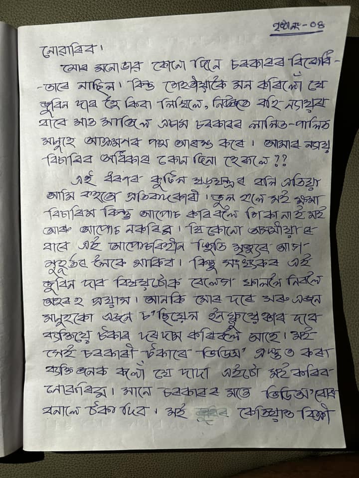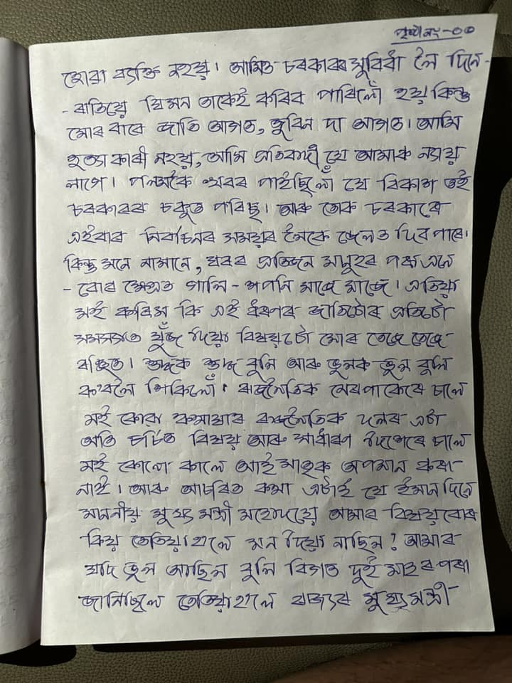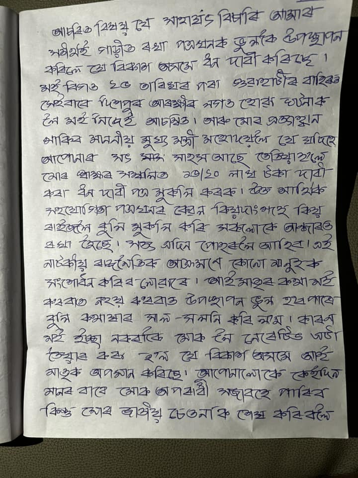 চিঠিত বিনা দোষত চৰকাৰৰ ৰোষত পৰা বুলি উল্লেখ কৰিছে।