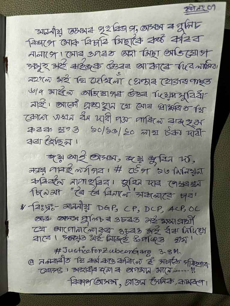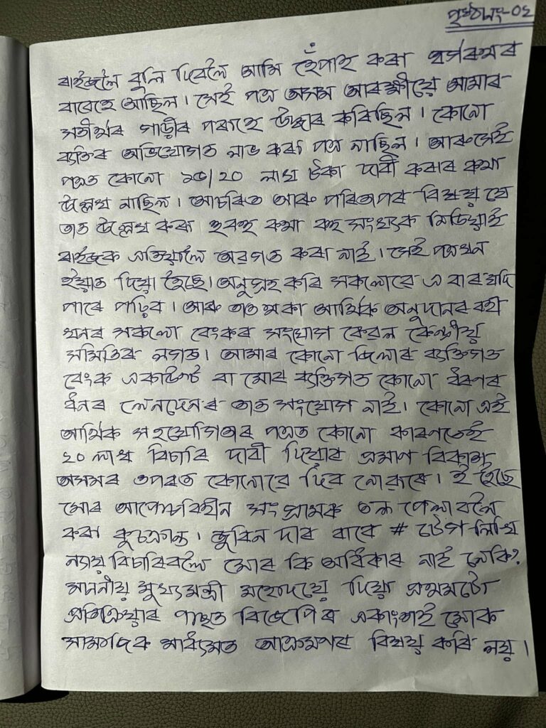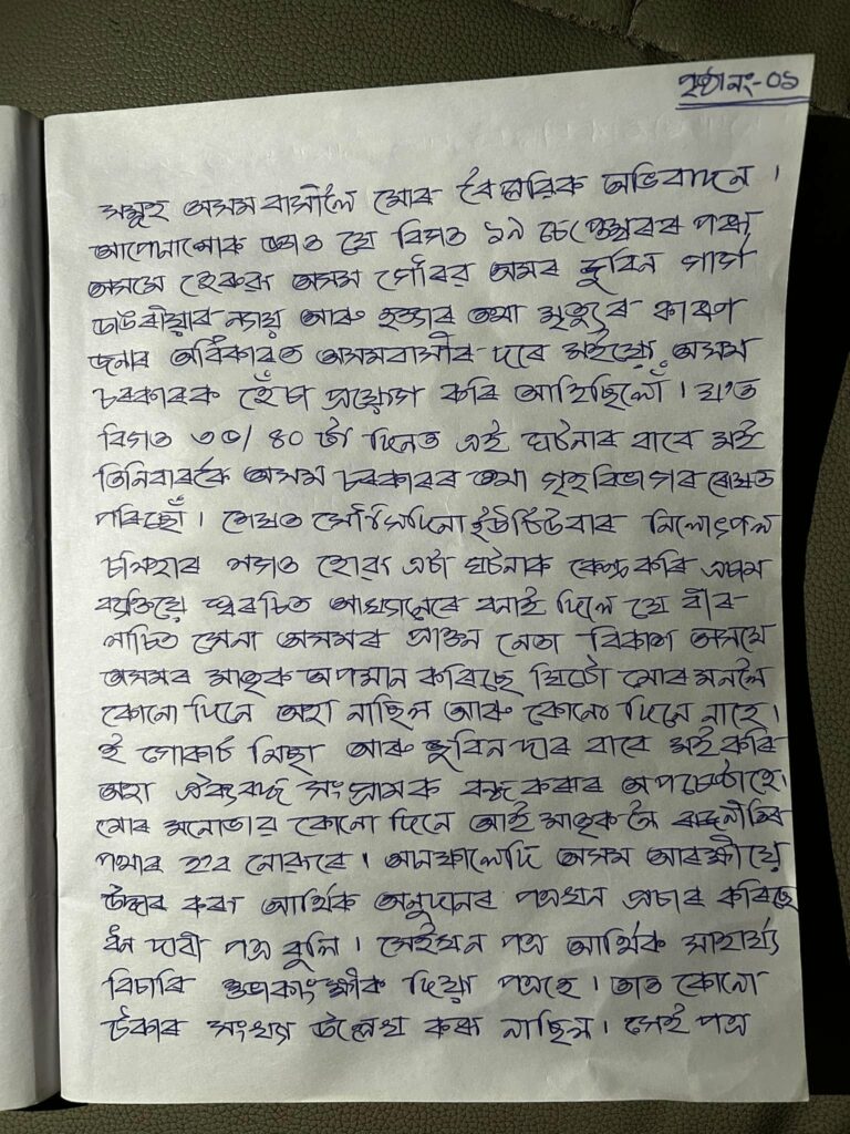 বিকাশ অসমে ৭পৃষ্ঠা জোৰা চিঠি লিখি নিজৰ সামাজিক মাধ্যমত আপলোড কৰিছিল।