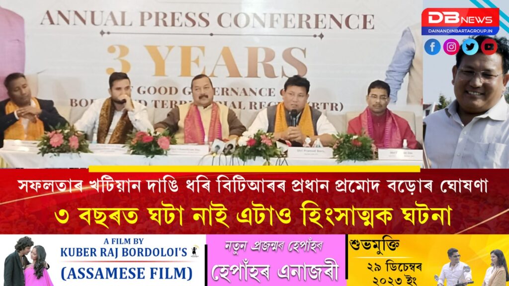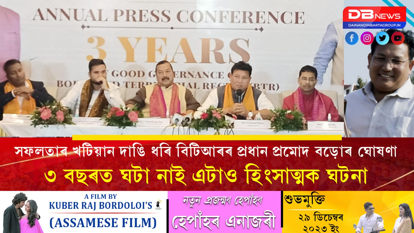 বি টি আৰত শান্তি, স্মাৰ্ট আৰু সেউজ বড়োভূমি গঢ়াৰ লক্ষ্যৰে শপত গ্ৰহণ কৰা প্ৰমোদ বড়োয়ে তিনিটা বছৰ সম্পূৰ্ণ কৰিলে। শনিবাৰে তিনি বছৰীয়া কাৰ্যকালৰ সফলতাৰ খটিয়ান দাঙি ধৰে৷ গুৱাহাটীৰ লিলি হোটেলত শনিবাৰে আয়োজিত এক সংবাদমেলত বি টি আৰ প্ৰধান প্ৰমোদ বড়োৱে কয় যে ১৯৫৭ ৰ পৰা বড়োভূমিত ৫০০০ লোকে শ্বহীদবৰণ কৰিলে৷ এটা সময়ত বি টি আৰত এক ভয়াৱহ পৰিৱেশ আছিল৷ কিন্তু এতিয়া সেই পৰিৱেশ সলনি হৈছে৷ বি টি আৰত ক্ৰমান্বয়ে শান্তিৰ পৰিৱেশ বিৰাজ কৰিছে৷ বড়োভূমিত হিংসা নাইকিয়া কৰি সকলোৰে নিৰাপত্তা সুনিশ্চিত কৰা তথা শান্তি, স্মাৰ্ট আৰু সেউজ বড়োভূমি হিচাপে গঢ়ি তোলাৰ মূল লক্ষ্য বান্ধি লোৱা হৈছে৷