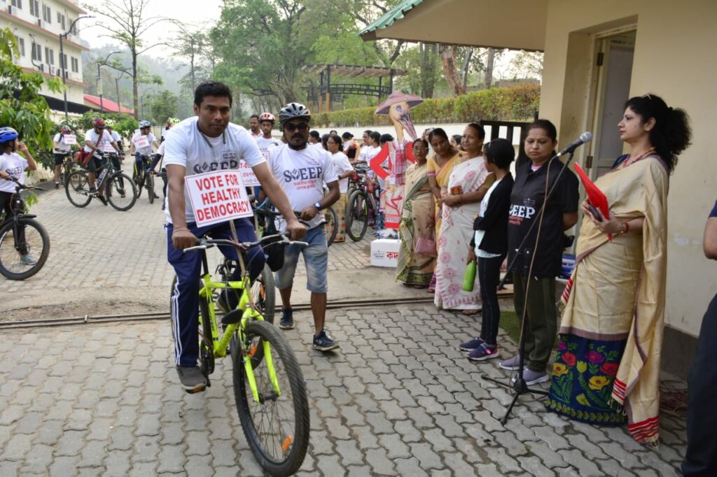 ভোটাৰৰ মাজত সজাগতা সৃষ্টি, ভোটদানৰ হাৰ বৃদ্ধি, যুৱ প্ৰজন্ম বিশেষকৈ প্ৰথমবাৰৰ বাবে ভোটাধিকাৰ লাভ কৰা সকলক ভোটদানৰ প্ৰতি আকৰ্ষন কৰাৰ উদ্দেশ্যে আজি পুৱা কামৰূপ মহানগৰ জিলা প্ৰশাসনৰ উদ্যোগত এক চাইকেল ৰেলী উলিওৱা হয়। কামৰূপ মহানগৰ নিৰ্বাচন জিলা প্ৰশাসনৰ প্ৰণালীবদ্ধ ভোটাৰৰ শিক্ষা আৰু নিৰ্বাচনী অংশগ্ৰহণ চমুকৈ SVEEP কোষৰ উদ্যোগত তথা অসম চাইক্লিং কমিটিৰ সহযোগত আজি পুৱা ৫.৩০ বজাত কামৰূপ মহানগৰ জিলা আয়ুক্তৰ কাৰ্যালয়ৰ সমীপৰ অমৃত উদ্যানৰ পৰা চাইকেল ৰেলীৰ শুভাৰম্ভ কৰা হয়। কামৰূপ মহানগৰ জিলা নিৰ্বাচন বিষয়া তথা জিলা আযুক্ত সুমিত সাত্তাৱনে পতাকা জোকাৰি ৰেলীৰ শুভাৰম্ভ কৰে। উক্ত ৰেলীত অংশগ্ৰহণকাৰীসকল দুটা ভাগত বিভক্ত হয়। এটা ভাগৰ অংশগ্ৰহণকাৰীসকলে অসম সচিবালয়–জি এছ ৰোড –উলুবাৰী হৈ পুনৰ অমৃত উদ্যানলৈ উভতি আহে । একেদৰে আনটো ভাগে নাৰেংগী তিনিআলি হৈ পুনৰ অমৃত উদ্যানলৈ উভতি আহি ৰেলীৰ সামৰণী মাৰে। এই ৰেলীৰ সৈতে এখন অ’ডিঅ’ ভানো আছিল য’ত ভোটদান সম্পৰ্কে সকলো শ্ৰেণীৰ ভোটাৰক সজাগ কৰি অহা ৭ মে’ত গুৱাহাটী লোকসভা সমষ্টিৰ নিৰ্বাচনৰ বাবে ভোটদান কৰিবলৈ আহ্বান জনোৱা হয়।