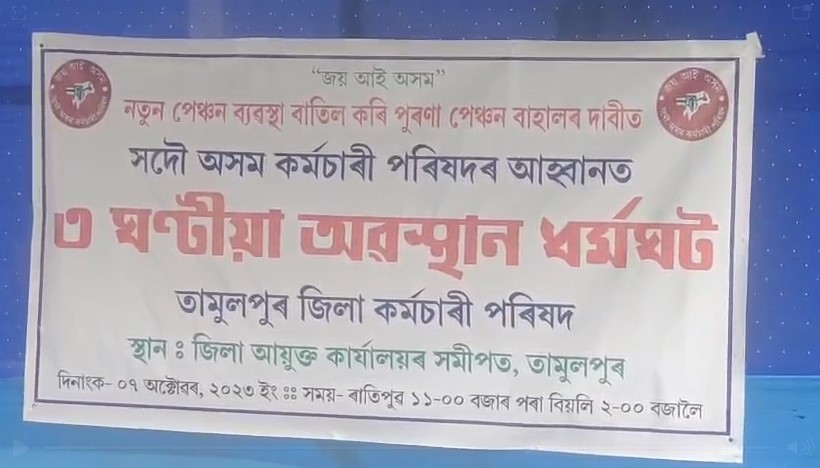 পুৱা ১১ বজাৰ পৰা ২ বজালৈ তামুলপুৰ আয়ুক্ত কাৰ্যালয় চৌহদত তামুলপুৰ জিলা কৰ্মচাৰী পৰিষদে ৩ ঘন্টীয়া অবস্থান ধৰ্মঘট কাৰ্যসুচী ৰুপায়ন কৰি নতুন পেঞ্চন বাতিল কৰি পুৰণি পেঞ্চন বাহাল ৰাখক, পুৰণি পেঞ্চন আমাৰ প্ৰাপ্য আদি বিভিন্ন শ্লোগান দিয়া পৰিলক্ষিত হয়।