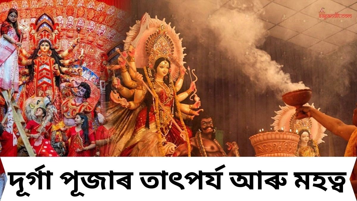 প্ৰাচীন কালৰ পৰাই অসমত দুৰ্গা পূজাৰ প্ৰচলন আছে। ধৰ্মীয় উৎসৱ বাবেই বিভিন্ন শাস্ত্ৰীয় ব্যাখ্যা, পৌৰাণিক কাহিনী, ৰীতি-নীতি, পৰম্পৰা ইয়াৰ সৈতে জড়িত হৈ আছে। ‘দুৰ্গ’ শব্দই দৈত্য, কুকৰ্ম, শোক-দুখ, মহাভয়, অতিৰোগ আদিক বুজায়। ‘আ’-কাৰৰ অৰ্থ— নাশক। অৰ্থাৎ যি দেৱীয়ে এই সকলোবোৰ নাশ কৰিব পাৰে, তেৱেঁই দুৰ্গা (Durga Puja 2024) । আনহাতে, দ+উ+ৰ+গ+আ=দুৰ্গা, ইয়াত দ শব্দৰ অৰ্থ দৈত্য নাশক, উ-কাৰৰ অৰ্থ বিঘিনি নাশক, ৰ— ৰোগ নাশক, গ— পাপ নাশক, অ— ভয় বা শত্ৰু নাশক। গতিকে দেখা যায় যে যিমানবোৰ অশুভ শক্তি আছে, সেই সকলোবোৰৰ বিনাশকাৰী হৈছে দেৱী দুৰ্গা। যুগে যুগে হিন্দু ধৰ্মৰ শাক্তপন্থী লোকসকলে দেৱী দুৰ্গাক সমাজৰ পৰা অপায়- অমংগল, বিভেদকামী শক্তিক নাশ কৰিবৰ বাবেই আৰাধনা কৰি আহিছে