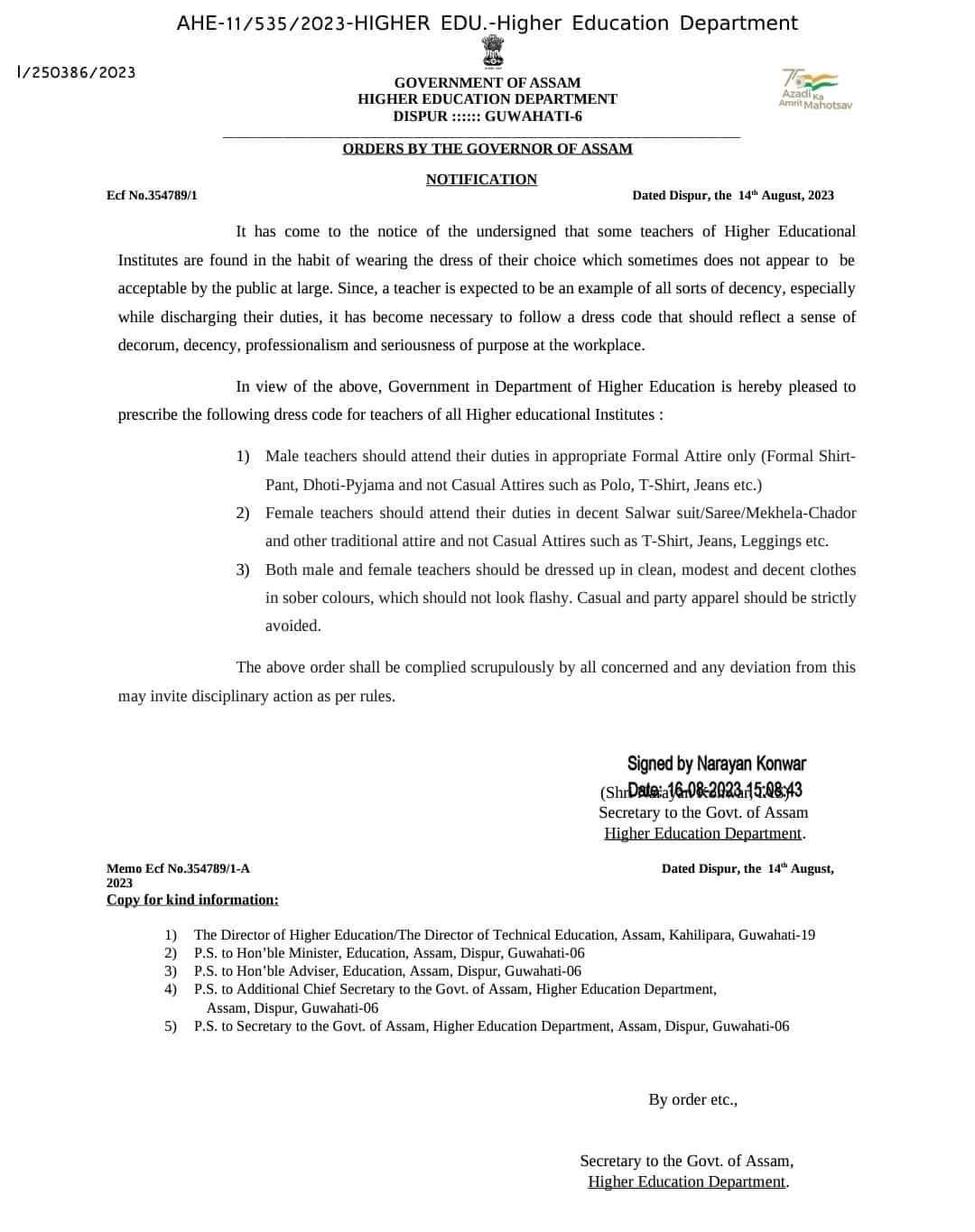 অধ্যাপিকাসকলে টি-চাৰ্ট, জিনছ, লেগিংছ আদি পিন্ধিব নোৱাৰিব বুলি নিৰ্দেশনাত উল্লেখ কৰিছে।