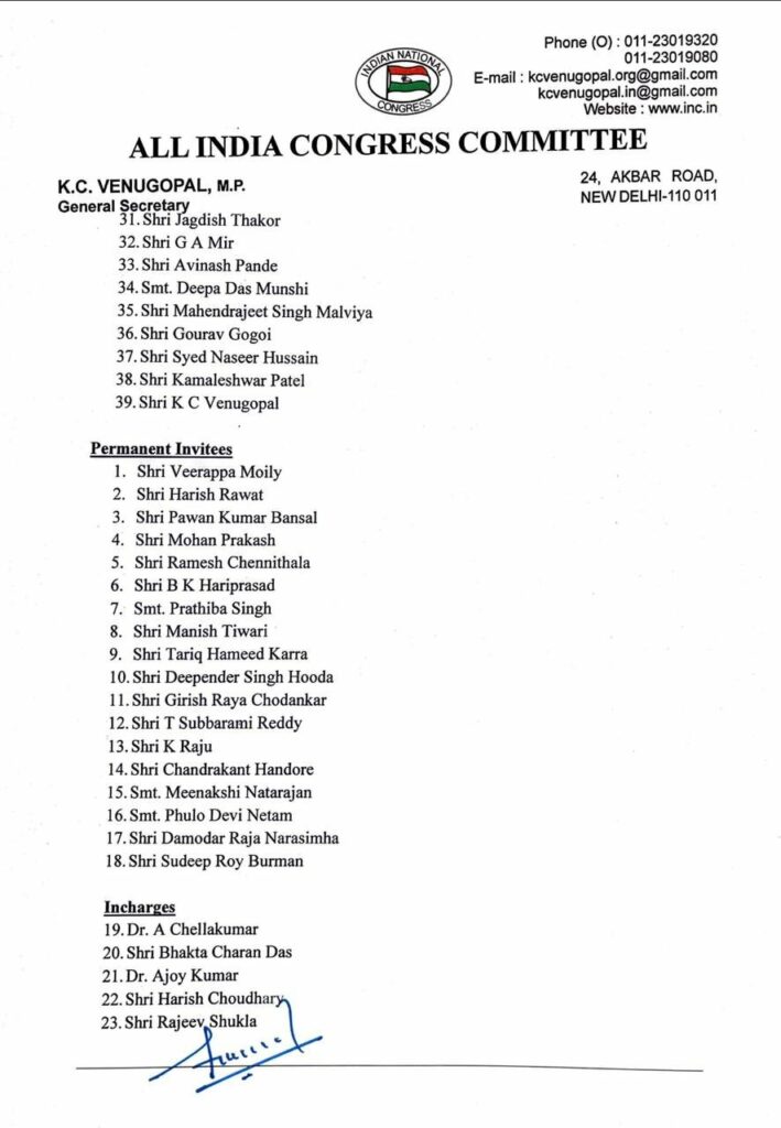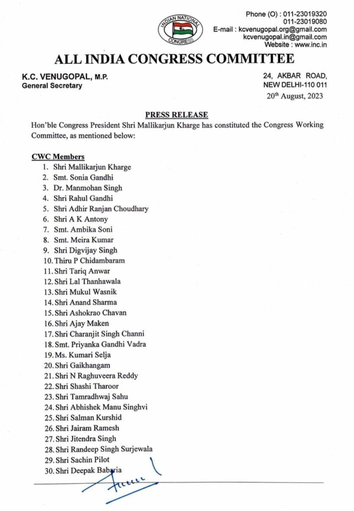 ভাৰতীয় জাতীয় কংগ্রেছ দলৰ প্ৰধান নীতি-নিৰ্ধাৰণ কমিটি হিচাবে পৰিগণিত হোৱা Congress Working Committee (CWC) খন আজি দলৰ সভাপতি মল্লিকাজুৰ্ন খৰ্গে গঠন কৰি ঘোষণা কৰে। কংগ্ৰেছ দলৰ কাৰ্য্যকৰী সমিতিত ৩৯ জন নেতাৰ নাম অন্তৰ্ভুক্ত কৰা হৈছে। ২০২৩ চনৰ গুৰুত্বপূৰ্ণ বিধানসভা নিৰ্বাচনৰ পূৰ্বে আজি কংগ্ৰেছ পাৰ্টিৰ ৰাষ্ট্ৰীয় সভাপতি মল্লিকাৰ্জুন খৰ্গে নিজৰ নতুন দলৰ তালিকা প্ৰকাশ কৰিছে। মল্লিকাৰ্জুন খৰ্গেৰ নতুন দলতো স্থান লাভ কৰিছে শচীন পাইলটে। একে সময়তে জি-২৩ গোটৰ শশী থাৰুৰ আৰু আনন্দ শৰ্মাকো কংগ্ৰেছ ৱৰ্কিং কমিটিত অন্তৰ্ভুক্ত কৰা হৈছে। নতুনকৈ গঠন হোৱা এই তালিকাত স্থান লাভ কৰিছে