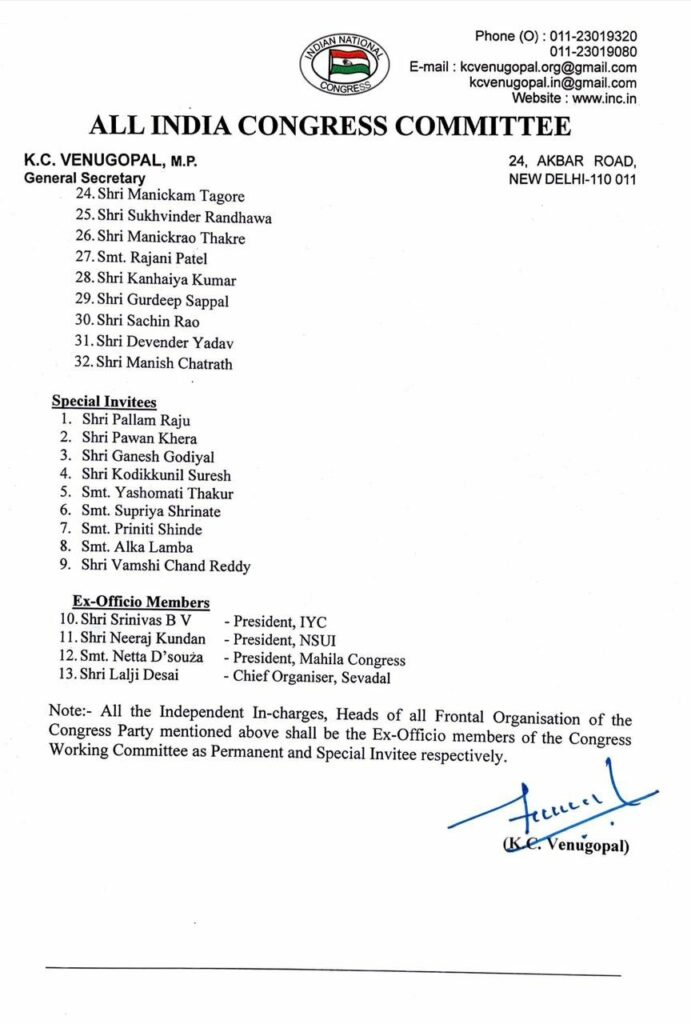 তথ্য অনুসৰি কংগ্ৰেছ দলৰ চাৰিটা ফৰৱাৰ্ড সংগঠন – যুৱ কংগ্ৰেছ, এন এছ ইউ আই, মহিলা কংগ্ৰেছ আৰু সেৱা দলৰ মুৰব্বীসকল চি ডব্লিউ চিৰ পদমৰ্মে সদস্য হ’ব। কওঁ কংগ্ৰেছ দলৰ সভাপতি মল্লিকাৰ্জুন খাৰ্গে যোৱা বছৰৰ অক্টোবৰ মাহত নিৰ্বাচনৰ পিছত দায়িত্ব গ্ৰহণ কৰিছিল। প্ৰায় ১০ মাহৰ অন্তত তেওঁ গঠন কৰিছে এখন নতুন কাৰ্য্যকৰী সমিতি। এই তালিকাত প্ৰিয়ংকা গান্ধী, এ কে এণ্টনি, মীৰা কুমাৰ, দিগবিজয় সিং, পি চিদাম্বৰম, আনন্দ শৰ্মা, শশী থাৰুৰকে ধৰি একাংশ জ্যেষ্ঠ নেতাক স্থান দিয়া হৈছে।