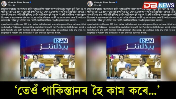 গৌৰৱ গগৈয়ে সংসদত দিয়া ভাষণ (Himanta Biswa Sarma) পাকিস্তানত ভাইৰেল হোৱাৰ পিছতেই প্ৰতিক্ৰিয়া মুখ্যমন্ত্ৰীৰ। সামাজিক মাধ্যমত গৌৰৱ গগৈক সমালোচনা কৰিলে মুখ্যমন্ত্ৰী ড০ হিমন্ত বিশ্ব শৰ্মাই। গৌৰৱ গগৈক সমালোচনা কৰি মুখ্যমন্ত্ৰীগৰাকীয়ে কয়, ‘যোৰহাটৰ আমাৰ সাংসদজনে কালি সংসদত দিয়া ভাষণে সন্দেহাতীতভাৱে প্ৰমাণ কৰি দিলে যে তেওঁ পাকিস্তানৰ হৈয়ে কাম কৰে। তেওঁৰ পাকিস্তানলৈ গোপন ভ্ৰমণ আৰু পাকিস্তানী প্ৰতিষ্ঠানৰ সৈতে ঘনিষ্ঠ সম্পৰ্কই বহু কথা স্পষ্ট কৰি তুলিছে। তেওঁৰ পত্নী আৰু দুই সন্তানৰ বিদেশী নাগৰিকত্ব থকা হেতুকে তেওঁ যিকোনো সময়তে ভাৰত এৰি যাব পাৰে। তেওঁৰ এইধৰণৰ কাৰ্যই আমাৰ অসমক বদনামী কৰিলে৷ লগতে ভাৰতবৰ্ষৰ গৌৰৱপূৰ্ণ ঐতিহ্য তথা কোটি কোটি ভাৰতীয়ক তেওঁ বিশ্বাসঘাতকতা কৰিলে৷’