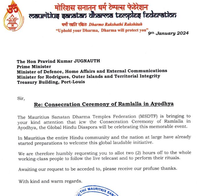 ২০১১ চনৰ লোকপিয়ল অনুসৰি মৰিচাছৰ ৪৮.৫ শতাংশ জনসংখ্যা হিন্দু সম্প্ৰদায়ৰ। মৰিচাছ প্ৰশাসনে জনোৱা মতে, ২২ জানুৱাৰীত ৰাম মন্দিৰ উপলক্ষে সকলো হিন্দু কৰ্মচাৰীক কামৰ পৰা দুঘণ্টাৰ বিৰতি দিয়া হ’ব। এই বিৰতি দুপৰীয়া ২ বজাৰ পৰা আৰম্ভ হ’ব। মৰিচাছ প্ৰশাসনে কয় যে হিন্দু শ্ৰমিকসকলে যাতে প্ৰাৰ্থনা কৰিব পাৰে তাৰ বাবে দুঘণ্টাৰ বিৰতি দিয়া হ’ব।