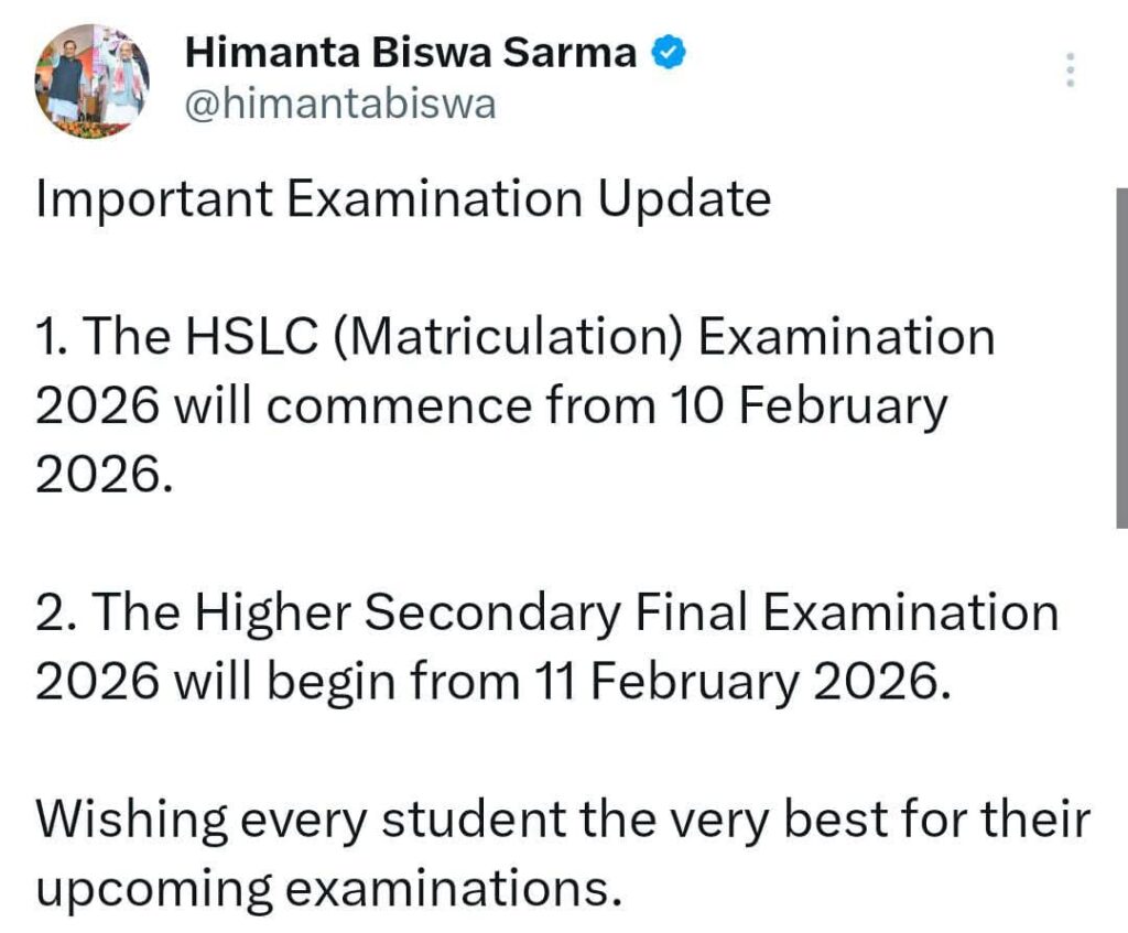 ২০২৬ৰ ১০ ফেব্ৰুৱাৰীৰ পৰা অনুষ্ঠিত হ’ব মেট্ৰিক পৰীক্ষা।