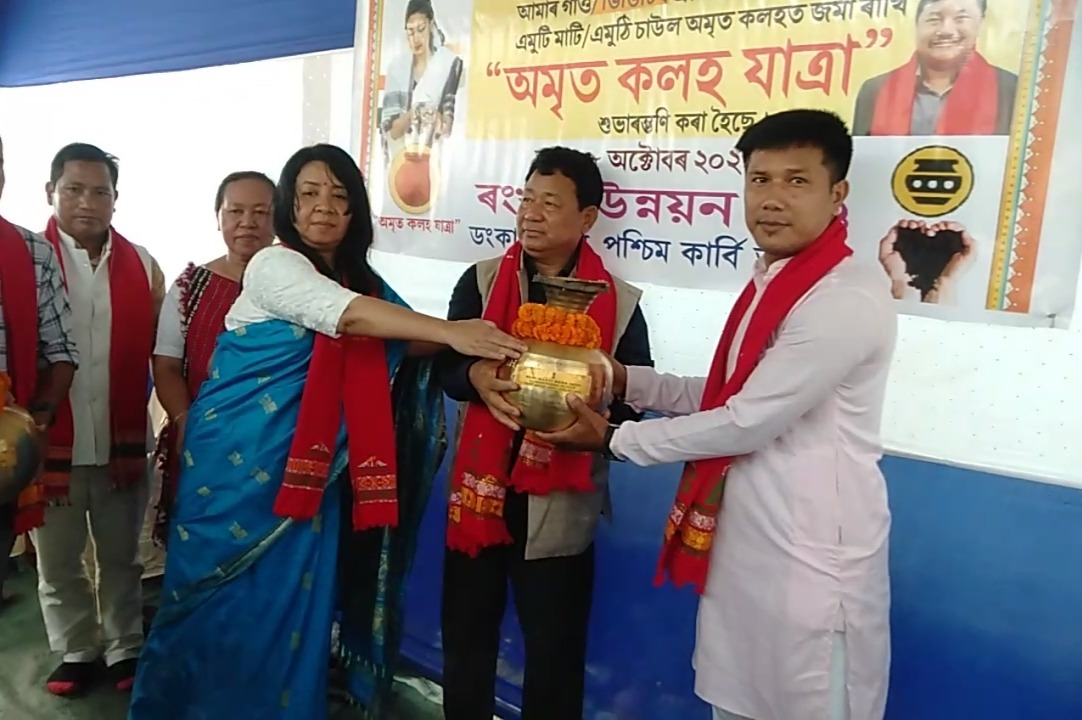 সমগ্ৰ দেশতে অমৃত কলহ যাত্ৰা কাৰ্যসূচী ধাৰাবাহিকভাৱে চলি থকাৰ সমান্তৰালকৈ পাহাৰীয়া জিলা পশ্চিম কাৰ্বি আংলঙৰ ডংকামোকামস্থিত ৰংখাং উন্নয়ন খণ্ডটো পাঁচটাকৈ পৰিষদীয় সমষ্টিক সামৰি অমৃত কলহ যাত্ৰাৰ শুভউদ্বোধন কৰা হয় ৷ ২০ নং বৈঠালাংছ’ সমষ্টিৰ বিধায়ক ৰূপছিং টেৰনে ফিটা কাটি শুভউদ্বোধন কৰা এই বৰ্নাঢ্য কাৰ্যসূচীত মুখ্য অতিথি হিচাপে উপস্থিত থাকে জিলা আয়ুক্তা কৃষ্ণা বৰুৱাই ৷ ৰংখাঙৰ খণ্ড উন্নয়ন বিষয়া ৰীতা ৰংহাপীয়ে আঁত ধৰা অনুষ্ঠানটিত অতিথিবৃন্দক কাৰ্বি প’হৰে সম্বৰ্ধনা জনোৱাৰ লগতে অমৃত কলহৰ যাত্ৰাবাহক ক্ৰমে টুটু নিগম আৰু প্ৰভাত গগৈকো আঁদৰণি জনোৱা হয় ৷ ৰংখাং পৰিষদীয় সমষ্টি, বিথুং-ৰেংথামা পৰিষদীয় সমষ্টি, কপিলী পৰিষদীয় সমষ্টি, হামৰেণ পৰিষদীয় সমষ্টি, কপিলী পৰিষদীয় সমষ্টি আৰু আমৰেং পৰিষদীয় সমষ্টিৰ আই-মাতৃসকলে কঢ়িয়াই অনা নিজ নিজ অঞ্চলৰ মাটিসমূহ সানমিহলি কৰে জিলা আয়ুক্তা কৃষ্ণা বৰুৱা, বিধায়ক ৰূপছিং টেৰন আৰু জিলা বিজেপিৰ সভাপতি ৰদীপ ৰংহাঙে ৷