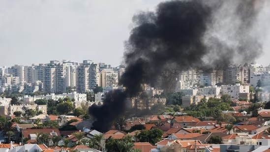 ইজৰাইলৰ টেল আভিভত গাজা ষ্ট্ৰিপৰ পৰা ৰকেট আক্ৰমণৰ ফলত এটা অট্টালিকা জ্বলি উঠে।