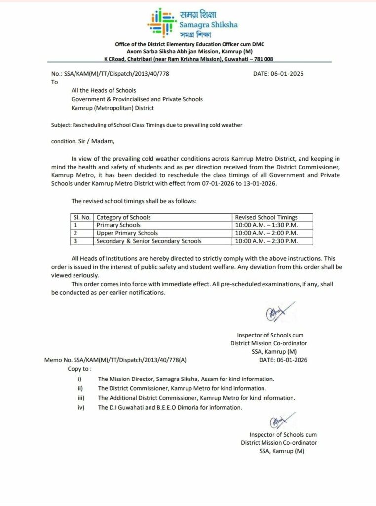 শীতৰ প্ৰকোপ বৃদ্ধিৰ বাবে কামৰূপ মহানগৰ জিলাত পাঠদানৰ সময়সূচী সলনি।