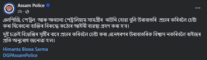‘এলপিজি, পে’ট্ৰল আৰু অন্যান্য পেট্ৰ’লিয়াম সামগ্ৰীৰ নাটনি হোৱা বুলি উৰাবাতৰি প্ৰচাৰ কৰিবলৈ চেষ্টা কৰা যিকোনো ব্যক্তিৰ বিৰুদ্ধে কঠোৰ আইনী ব্যৱস্থা গ্ৰহণ কৰা হ’ব।’