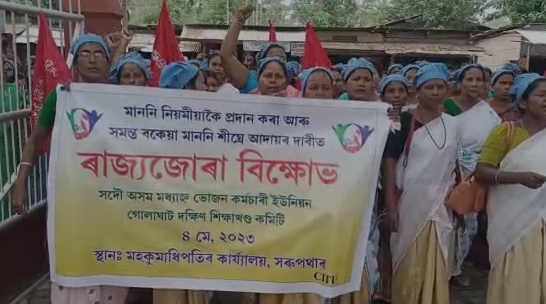 বৃহস্পতিবাৰে সদৌ অসম মধাহ্ন ভোজন কৰ্মচাৰী ইউনিয়নে ৰাজ্যৰ বিভিন্ন প্ৰান্তৰৰ লগতে সংগঠনটোৰ অন্তৰ্গত দক্ষিণ গোলাঘাট শিক্ষা খণ্ড কমিটিৰ সদস্য সকলেও ধনশিৰি মহকুমাৰ সৰুপথাৰতো ৰাজ্য চৰকাৰে বিৰুদ্ধে এক বিক্ষোভ কাৰ্যসূচী হাতত লয় ৷ প্ৰতিবাদী মহিলা সকলে ধনশিৰি মহকুমাৰ সৰুপথাৰৰ নগৰৰ মাজেদি ৰাজ্য চৰকাৰে ৰান্ধনী সকলৰ বকেয়া মাননি অতিশীঘ্ৰে আদায় দিয়া, প্ৰতিমাহৰ প্ৰথম সপ্তাহৰ ভিতৰত পূৰ্বৰ মাহৰ মাননি নিয়মীয়াকৈ আৰু সম্পূৰ্ণকৈ আদায় দিয়াৰ লগতে বছৰটোৰ ১২ মাহৰ বাবে মাননী প্ৰদান কৰা আদি শ্ল’গানেৰে ধনশিৰি মহকুমাৰ মহকুমাধিপতিৰ কাৰ্যালয়লৈকে প্ৰতিবাদী কাৰ্যসুচী ৰূপায়ন কৰে৷