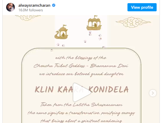 শুকুৰবাৰে ৰাম চৰণৰ কন্য়াৰ নামকৰণ অনুষ্ঠান অনুষ্ঠিত হয়। এতিয়া দম্পতীহালে প্ৰকাশ কৰিছে কণমানিটিৰ নাম। শুকুৰবাৰে অনুষ্ঠিত হোৱা নামকৰণ অনুষ্ঠানৰ পিছত অভিনেতাগৰাকীয়ে সামাজিক মাধ্যমত এটা পোষ্ট শ্বেয়াৰ কৰি নাম প্ৰকাশ কৰিছে। এতিয়া ৰাম চৰণে তেওঁৰ কণমানিটিক ‘ক্লিন কাৰা কনিদেলা’ বুলি মাতিব। এটা পোষ্ট শ্বেয়াৰ কৰি তেওঁ কন্যাৰ নাম আৰু তাৰ অৰ্থ প্ৰকাশ কৰিছে। নামটো বৰ ধুনীয়া, এই নামটোৰ অৰ্থ হৈছে