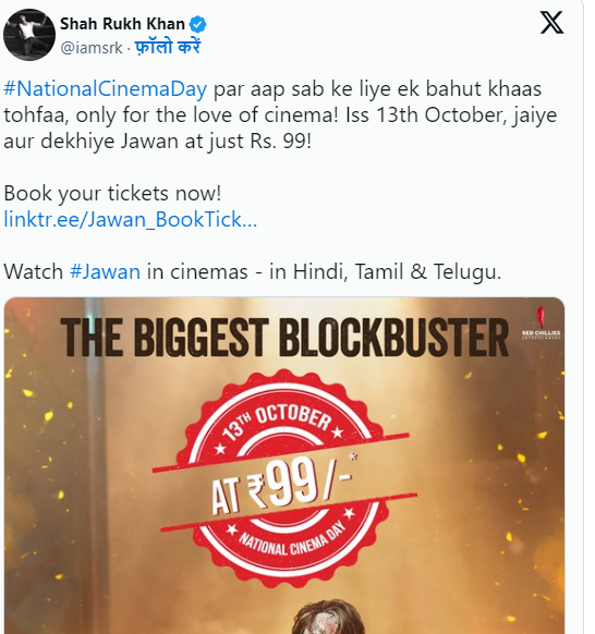 ৰাষ্ট্ৰীয় চিনেমা দিৱস উপলক্ষে সমগ্ৰ দেশৰ চিনেমাগৃহত চলি থকা সকলো ছবিৰ টিকটৰ মূল্য মাত্ৰ ৯৯ টকাত ৰখা হৈছে। যদিও এই ৰেটসমূহ কেৱল ২ডিৰ বাবে, থ্ৰীডি, আইমেক্স আৰু ৪ডিএক্সো কম ৰেটত উপলব্ধ, কিন্তু ৯৯ টকাত নহয়। এই পৰ্যন্ত সমগ্ৰ দেশতে এই ছবিখনৰ প্ৰায় ১ লাখ টিকট বিক্ৰী হৈছে। ইমান ডাঙৰ সঁহাৰি দেখি প্ৰদৰ্শকসকলেও কাইলৈ বিপুল জনসমাগমৰ আশা কৰি জৱান শ্ব’ৰ সংখ্যাও বৃদ্ধি কৰিছে।