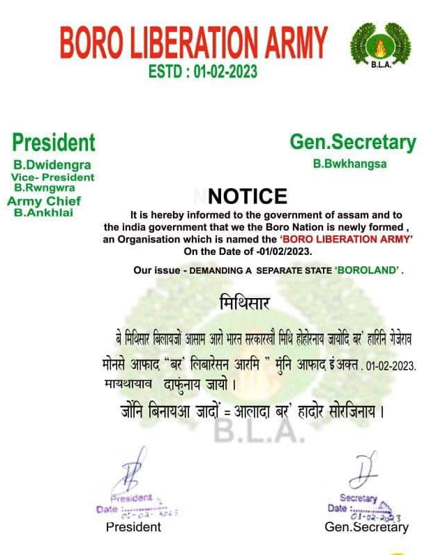 কেন্দ্ৰীয় চৰকাৰ আৰু অসমৰ ৰাজ্য চৰকাৰক সম্বোধন কৰি এক প্ৰেছ বিবৃতিত উক্ত উগ্ৰপন্থী সংগঠনটোৱে উল্লেখ কৰিছে যে ২০২৩ চনৰ ১ ফেব্ৰুৱাৰী মাহত সুকীয়া ৰাজ্য ‘বড়োলেণ্ড’ৰ দাবীৰে বিটিআৰত এই নতুন নিষিদ্ধ সংগঠনৰ জন্ম হৈছে।