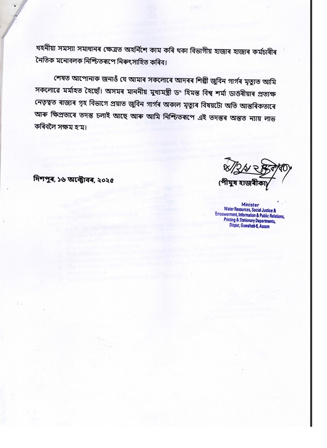 মন্ত্ৰী হাজৰীকাই পত্ৰখনত আৰু উল্লেখ কৰে যে সকলোৰে আদৰৰ শিল্পী জুবিন গাৰ্গৰ মৃত্যুত সকলোৱেই মৰ্মাহত হৈছে আৰু অসমৰ মুখ্যমন্ত্ৰী ড° হিমন্ত বিশ্ব শৰ্মাৰ প্ৰত্যক্ষ নেতৃত্বত ৰাজ্যৰ গৃহ বিভাগে প্ৰয়াত জুবিন গাৰ্গৰ অকাল মৃত্যুৰ বিষয়টো অতি আন্তৰিকতাৰে আৰু ক্ষিপ্ৰতাৰে তদন্ত চলাই আছে আৰু নিশ্চিতৰূপে আমি এই তদন্তৰ অন্তত ন্যায় লাভ কৰিবলৈ সক্ষম হ’ম।