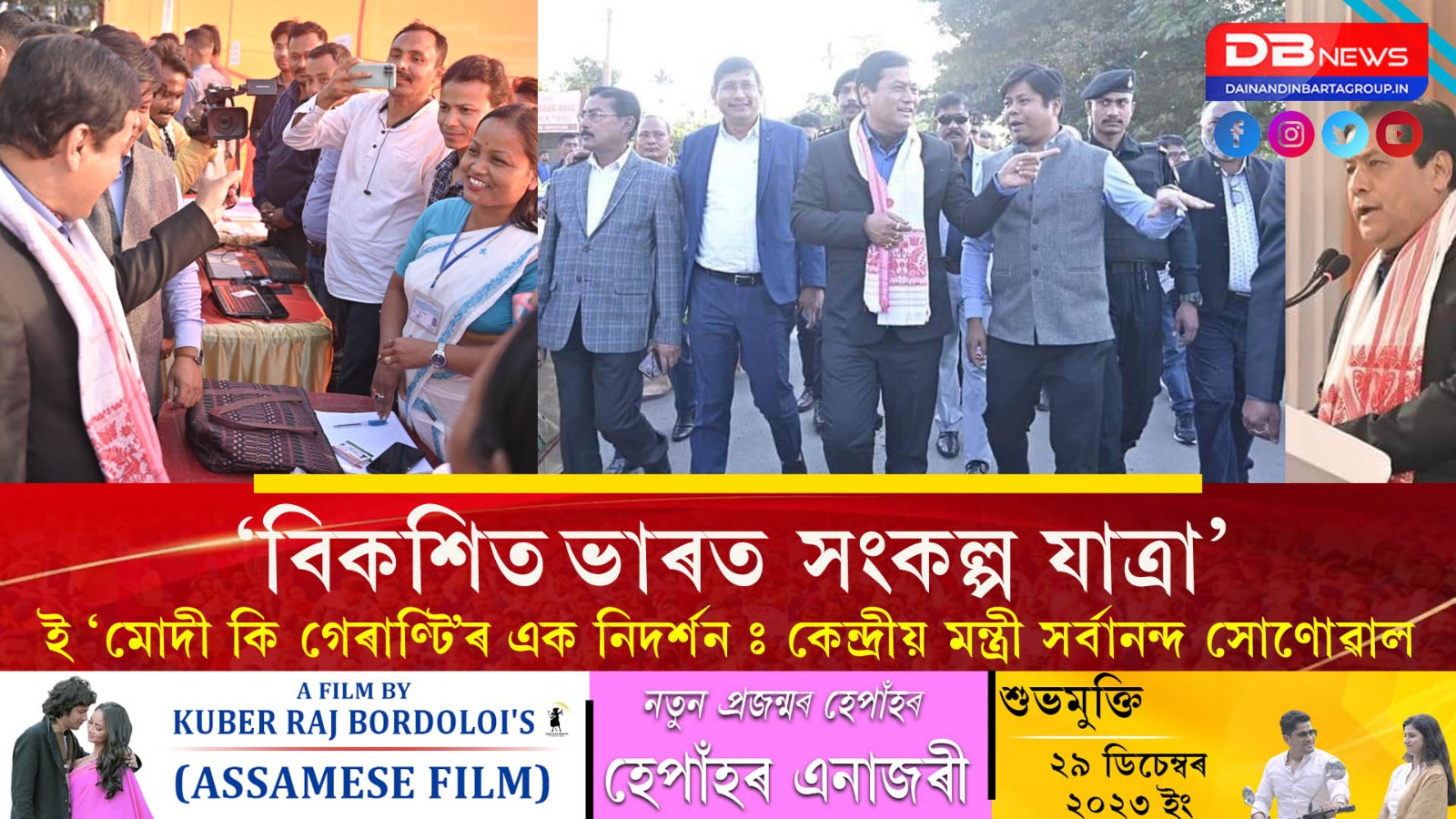 প্ৰধানমন্ত্ৰী নৰেন্দ্ৰ মোদীয়ে শনিবাৰে ভিডিঅ’ কনফাৰেন্সৰ জৰিয়তে ‘বিকশিত ভাৰত সংকল্প যাত্ৰা’ৰ হিতাধিকাৰীসকলৰ সৈতে মত বিনিময় কৰে। দেশৰ বিভিন্ন প্ৰান্তৰ লগতে অসমৰ হিতাধিকাৰীও আজিৰ এই সংকল্প যাত্রাত চামিল হয়। এই সময়ছোৱাত কেন্দ্রীয় মন্ত্রী সর্বানন্দ সোণোৱালে ডিব্ৰুগড় জিলাৰ পৰা বিকশিত ভাৰত সংকল্প যাত্ৰাত সংযুক্ত হয়। বিকশিত আৰু আত্মনিৰ্ভৰ ভাৰত গঢ়াৰ ঐক্যবদ্ধ সংকল্পেৰে শনিবাৰে কেন্দ্রীয় মন্ত্রী সর্বানন্দ সোণোৱালে ডিব্ৰুগড়ৰ ধামদুমীয়াত ‘বিকশিত ভাৰত সংকল্প যাত্রা’ত অংশগ্রহণ কৰে আৰু বিকশিত ভাৰতৰ সংকল্প পাঠ কৰে।