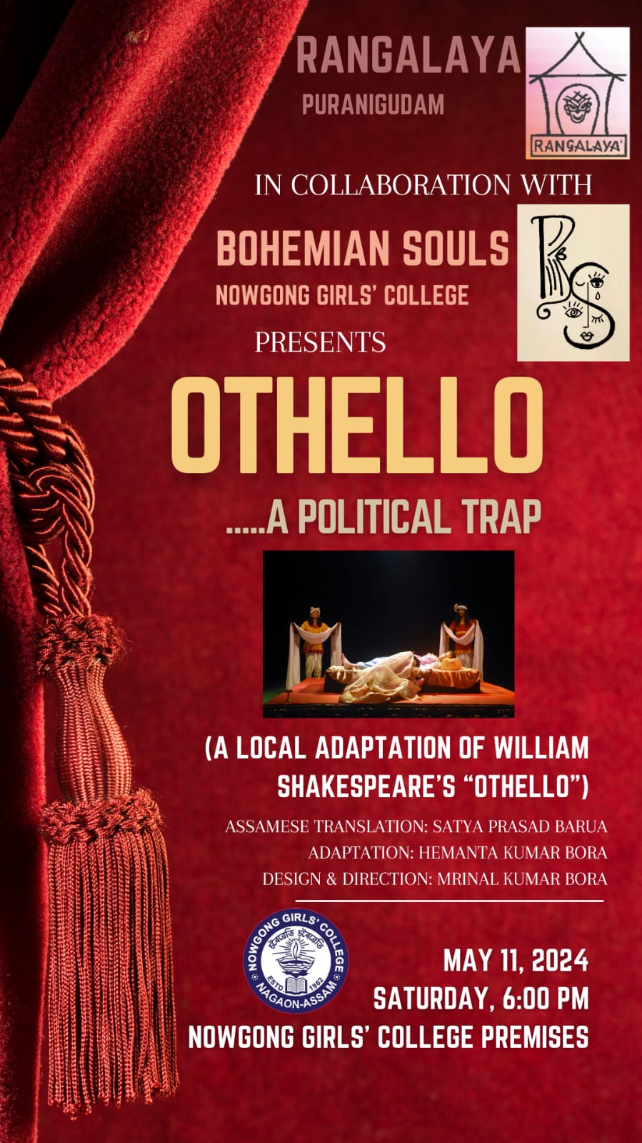 অসমৰ এটা নিয়মীয়া নাট্যদল নগাঁও জিলাৰ পুৰণিগুদামৰ ৰংগালয় । ইতিমধ্যে ভালেকেইখন উন্নত মানৰ নাট্য প্রযোজনাৰে ৰাষ্ট্ৰীয় পৰ্যায়ত স্থান লাভ কৰিবলৈ সক্ষম হোৱা এই নাট্যদলটোৱে অহা ১১ মে’ তাৰিখে নগাঁও ছোৱালী মহাবিদ্যালয়ৰ প্ৰেক্ষাগৃহত বৰহেমীয়ান চ’লছৰ সহযোগত মনস্থ কৰিব বিশ্ববিখ্যাত নাট্যকাৰ উইলিয়াম শেক্সপীয়েৰৰ কালজয়ী নাটক অথেল’ৰ অসমীয়া অভিযোজনা “অথেল’ — এ পলিটিকেল ট্রেপ” ।