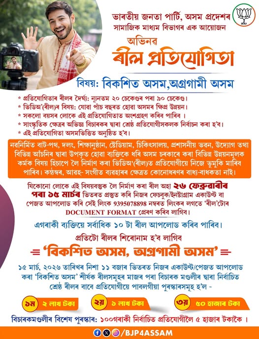 ভাৰতীয় জনতা পাৰ্টি,অসম প্ৰদেশৰ সামাজিক মাধ্যম বিভাগৰ উদ্যোগত অসম ভিত্তিত আয়োজন কৰা হৈছে ৰচনা প্ৰতিযোগিতা আৰু অভিনৱ ৰীল প্ৰতিযোগিতা।