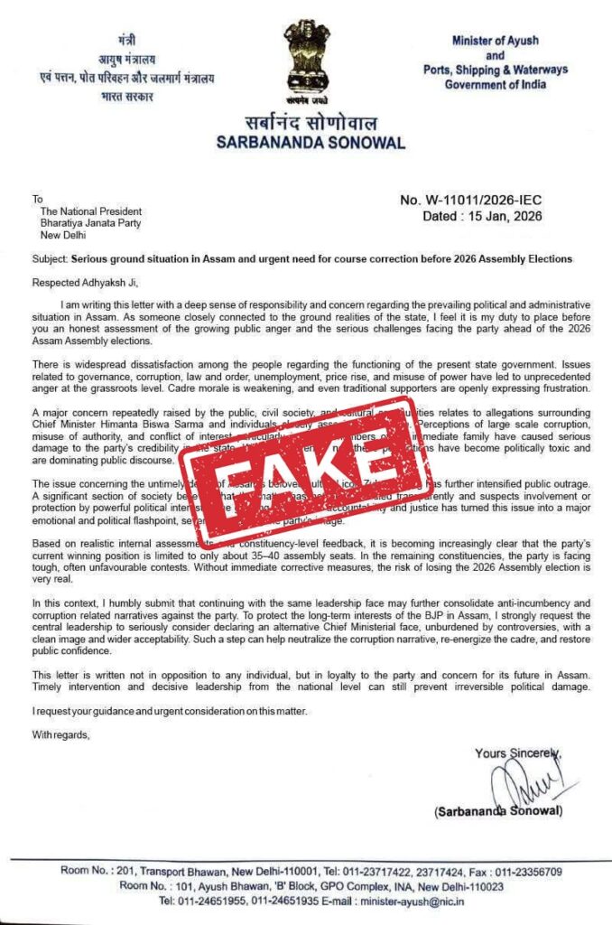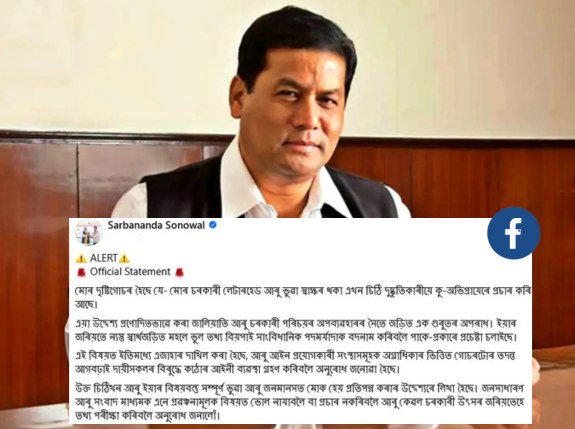 আমাৰ(Sarbananda Sonowal)দৃষ্টিগোচৰ হৈছে যে-কেন্দ্ৰীয় মন্ত্ৰী সৰ্বানন্দ সোণোৱালৰ চৰকাৰী লেটাৰহেড আৰু ভুৱা স্বাক্ষৰ থকা এখন চিঠি দুষ্কৃতিকাৰীয়ে কু-অভিপ্ৰায়েৰে প্ৰচাৰ কৰি আছে। এয়া উদ্দেশ্য প্ৰণোদিতভাৱে কৰা জালিয়াতি আৰু চৰকাৰী পৰিচয়ৰ অপব্যৱহাৰৰ সৈতে জড়িত এক গুৰুতৰ অপৰাধ।