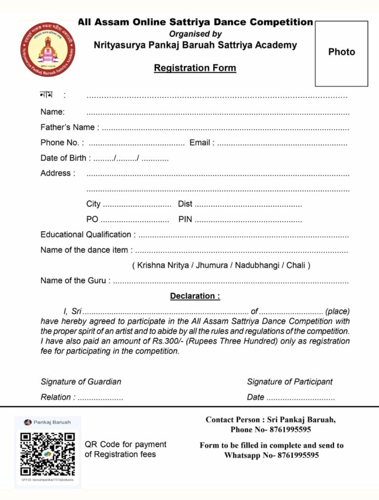 আনহাতে দুটা উদগণি বঁটা থাকিব । ইয়াৰ উপৰি অংশগ্ৰহণকাৰী সকলো প্ৰতিযোগীক একাডেমীৰ ফালৰ পৰা প্ৰমাণ-পত্ৰ আগবঢ়োৱা হ’ব । আঠ বছৰ বয়সৰ পৰা বিশ বছৰ বয়সৰ ছাত্ৰ-ছাত্ৰীৰ মাজত মুকলি থকা প্ৰতিযোগিতা খনত প্ৰতিযোগীয়ে শুদ্ধ সত্ৰীয়া সাজপাৰত লৱণু চুৰি কৃষ্ণ নৃত্য, ঝুমুৰাৰ ৰামদানি, নাদুভঙ্গীৰ ৰামদানি আৰু শুদ্ধ চালি নাচৰ ৰামদানি পৰিবেশন কৰিব পাৰিব । পৰিবেশনৰ সময় পাঁচ মিনিট ধাৰ্য কৰা হৈছে । পঞ্জীয়ন মাচুল মাত্ৰ ৩০০ টকা । প্ৰতিযোগীয়ে Nrityasurya Pankaj Baruah Sattriya Academy- ৰ পেজত নৃত্য পৰিবেশনৰ ভিডিও আপলোড কৰিব লাগিব । উল্লেখ্য যে, পূৰ্বে মঞ্চত পৰিবেশন কৰা ভিডিও প্ৰতিযোগিতাৰ বাবে গ্ৰহণযোগ্য নহ’ব । সকলো প্ৰতিযোগীয়ে বয়সৰ প্ৰমাণ-পত্ৰৰ ফটো কপি আৰু পঞ্জীয়ন মাচুলৰ স্ক্ৰীনশ্বট ৮৭৬১৯৯৫৫৯৫ নম্বৰত হোৱাটচপ্‌ যোগে পঠোৱাটো বাধ্যতামূলক ।