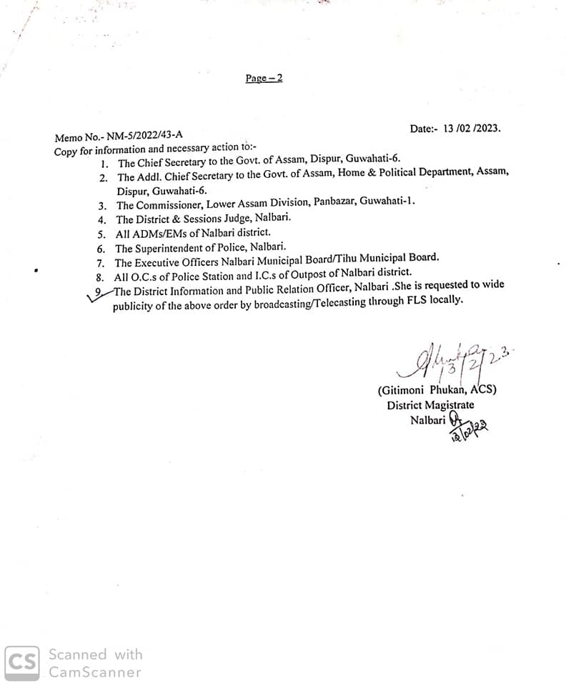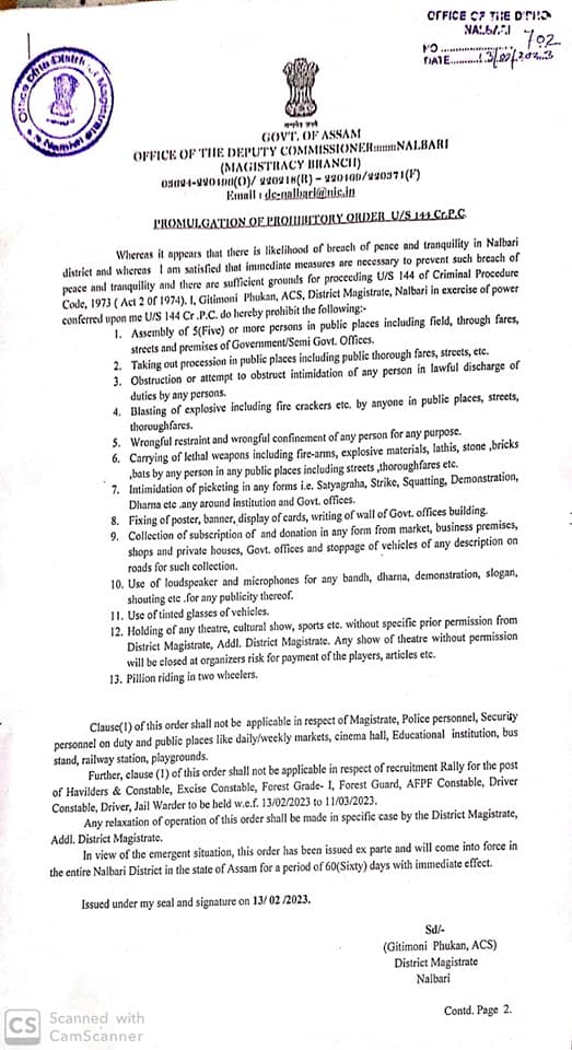 ইফালে, উত্থাপিত পৰিস্থিতিৰ পৰিপ্ৰেক্ষিতত এই নিৰ্দেশ এক্স পাৰ্টৰ দ্বাৰা জাৰি কৰা হৈছে আৰু তাৎক্ষণিকভাৱে কাৰ্যকৰী হোৱাকৈ অসমৰ সমগ্ৰ নলবাৰী জিলাত ৬০ দিনৰ বাবে বলবৎ হ’ব বুলি জানিব পৰা গৈছে।