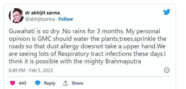 ইয়াৰ পূৰ্বে ৫ ফেব্ৰুৱাৰীত অসমৰ গোৱাহাটী চিকিৎসা মহাবিদ্যালয় হাস্পতালৰ অধীক্ষকে নিজৰ টুইটাৰ হেণ্ডেললৈ লৈ লিখিছিল, “গুৱাহাটী ইমান শুকান।৩ মাহ ধৰি বৰষুণ নাথাকে। মোৰ ব্যক্তিগত মতামত হ’ল জিএমচিয়ে গছ-গছনি, গছ-গছনি, আৰু ৰাস্তা-ঘাটত পানী ছটিয়াই দিব লাগে।” যাতে ধূলিৰ এলাৰ্জীয়ে ঠাই ল’ব নোৱাৰে। আমি আজিকালি বহুত শ্বাস-প্ৰশ্বাসৰ সংক্ৰমণ দেখিবলৈ পাইছো। মই ভাবো শক্তিশালী ব্ৰহ্মপুত্ৰৰ দ্বাৰা সম্ভৱ।”