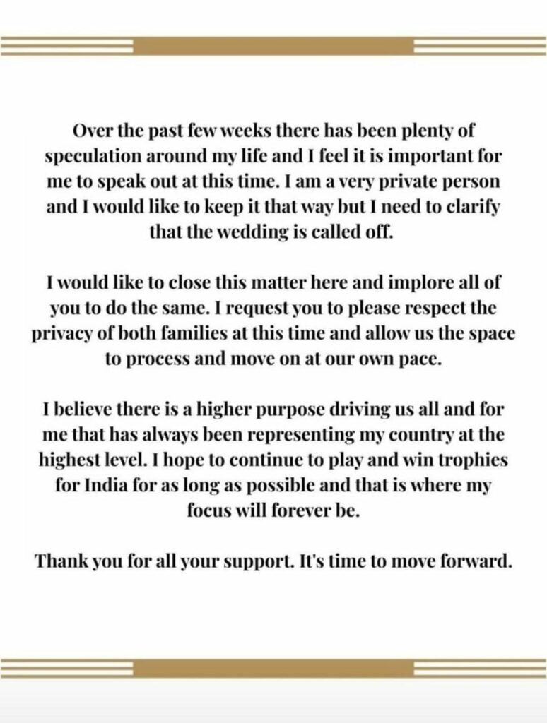 মান্ধনাই পোষ্টটোত লিখিছে, “যোৱা কেইসপ্তাহমানৰ পৰা মোৰ জীৱনক লৈ বহু জল্পনা-কল্পনা চলিছে আৰু এই সময়ত মই সকলোকে জনোৱাটৈ গুৰুত্বপূৰ্ণ বুলি অনুভৱ কৰিছো। মই স্পষ্টকৈ ক’ব বিচাৰো যে বিয়াখন বাতিল কৰা হৈছে।”