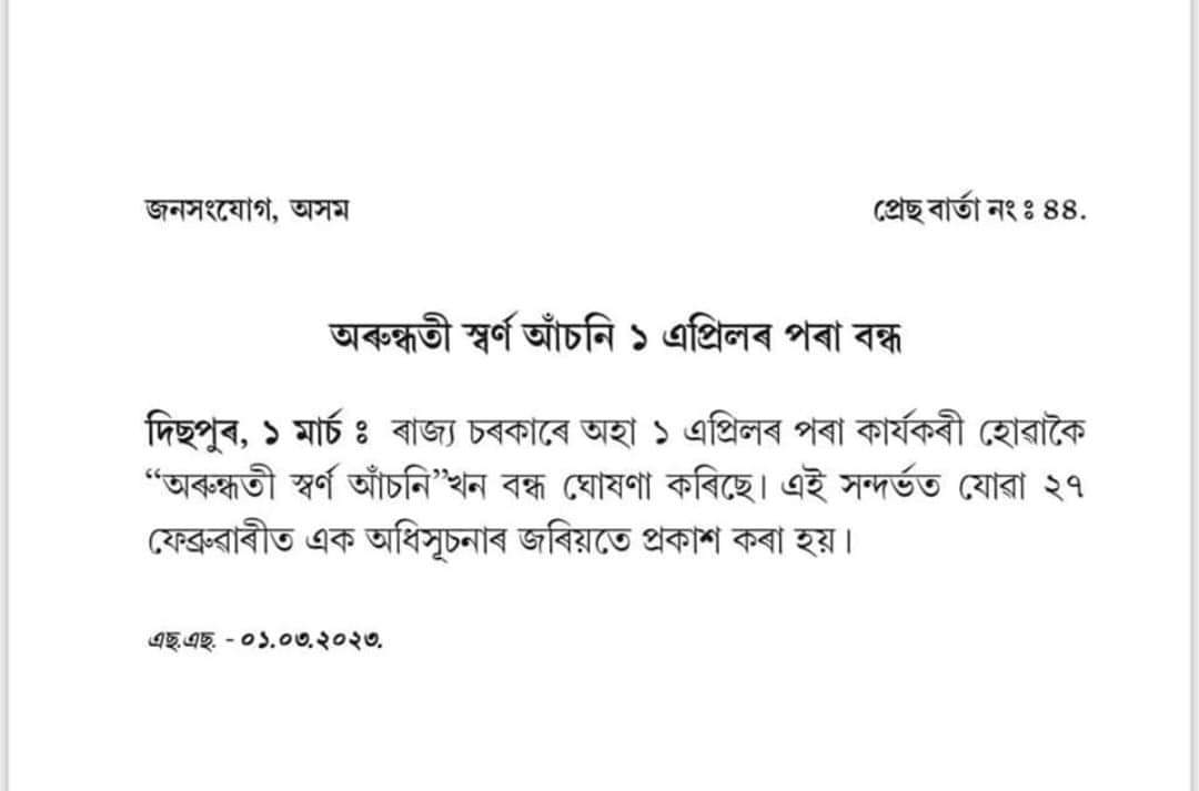 March 2, 2023 নৱ-বিবাহিতলৈ দুঃখবৰ ! ‘অৰুন্ধতী স্বৰ্ণ আঁচনি’ বন্ধ… Share FacebookTwitterWhatsAppTelegramKooEmail নৱ-বিবাহিতলৈ দুঃখবৰ ‘অৰুন্ধতী স্বৰ্ণ আঁচনি’ বন্ধ ১ এপ্ৰিলৰ পৰা বন্ধ হ’ব আঁচনিখন এই সন্দৰ্ভত ২৭ ফেব্ৰুৱাৰীত এক অধিসূচনা জাৰি কৰে আগন্তুক বিত্তীয়বৰ্ষৰ পৰা ৰাজ্য চৰকাৰে বন্ধ কৰিব অৰুন্ধতী স্বৰ্ণ আঁচনি। Author: দৈনন্দিন বাৰ্তা Related Articles Narendra Modi: ২০ ডিচেম্বৰত অসমলৈ আহিব প্ৰধানমন্ত্ৰী নৰেন্দ্ৰ মোদী দৈনন্দিন বাৰ্তা - December 17, 2025 Guwahati News: গুৱাহাটীৰ মহানগৰীক লৈ Smart City Limitedৰ নতুন পদক্ষেপ দৈনন্দিন বাৰ্তা - December 17, 2025 Himanta Biswa Sarma : প্ৰতিশ্ৰুতি পুৰণ কৰিলে মুখ্যমন্ত্ৰী ড° হিমন্ত বিশ্ব শৰ্মাই দৈনন্দিন বাৰ্তা - December 17, 2025