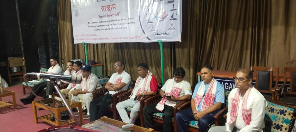 নৱম আন্তঃৰ্জাতিক যোগ দিৱসৰ লগত সংগতি ৰাখি স্বেচ্ছাসেৱী অনুষ্ঠান স্বাস্থ্যমৰ উদ্যোগত গুৱাহটীৰ কমাৰ্চ কলেজৰ প্ৰেক্ষাগৃহত ভাৰতীয় যোগ সংস্কৃতি আৰু যোগ চিকিৎসা কেন্দ্ৰৰ সহযোগত সূৰ্য্য নমস্কাৰ চেলেঞ্জ এক আকৰ্ষণীয় পৰিৱেশত অনুষ্ঠিত হয় ৷ শতাধিক প্ৰতিযোগীয়ে অংশগ্ৰহণ কৰা এই প্ৰতিযোগিতাত ৮৯ গৰাকীয়ে গল্ড চাৰ্টিফিকেট, ৫ গৰাকীয়ে চিলভাৰ আৰু ৬ গৰাকীয় ব্ৰঞ্জৰ চাৰ্টিফিকেট লাভ কৰে ৷ ঔমকাৰ আৰু পাৰ্থনাৰে আৰম্ভ হোৱা অনুষ্ঠানটো বন্তি প্ৰজ্বলেনেৰে শুভ উদ্বোধন কৰে অসমৰ এগৰাকী বিশিষ্ট ক্ৰীড়াবিদ ডিচকাচ থ্ৰ’ৱ ত পাঁচবাৰৰ ৰাষ্ট্ৰীয় চেম্পিয়ন তৈয়বুণ নেচাই ৷ ১০৮ বাৰ সূৰ্য্য নমস্কাৰ চেলেঞ্জ প্ৰতিযোগিতা অংশগ্ৰহণ কৰা শতকৰা ৯৮ ভাগ প্ৰতিযোগীয়ে সফলভাৱে সম্পূৰ্ণ কৰে ৷