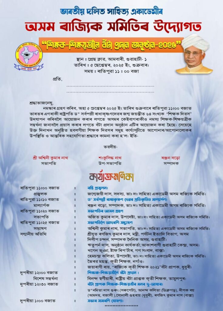 ভাৰতীয় দলিত সাহিত্য (Teachers Day) একাডেমীৰ অসম ৰাজ্যিক সমিতিৰ উদ্যোগত অহা ৫ ছেপ্টেম্বৰ তাৰিখ শুক্রবাৰে গুৱাহাটীৰ আমবাৰীস্থিত প্রেছ ক্লাৱত দিনৰ ১১ বজাৰ পৰা ভাৰতৰ দ্বিতীয় গৰাকী ৰাষ্ট্ৰপতি ড° সৰ্বপল্লী ৰাধাকৃষ্ণণৰ জন্ম জয়ন্তীত ৬৪ সংখ্যক “শিক্ষক দিৱস” উদযাপনৰ আয়োজন কৰা হৈছে । শিক্ষক দিৱসৰ লগত সংগতি ৰাখি অসমৰ কেইবাগৰাকীও নমস্য শিক্ষক-শিক্ষয়ত্রীক সম্বর্ধনা জনাবলৈ প্রয়াস কৰাৰ লগতে বঁটা প্রদান অনুষ্ঠানৰ আয়োজন কৰা হৈছে বুলি এক সংবাদ বিজ্ঞপ্তিৰ জৰিয়তে ভাৰতীয় দলিত সাহিত্য একাডেমীৰ অসম ৰাজ্যিক সমিতিৰ সভাপতি অশ্বিনী কুমাৰ নাথ, উপসভাপতি শংকুসিদ্ধ নাথ আৰু সম্পাদক ৰঞ্জন বড়োৱে জানিবলৈ দিছে।