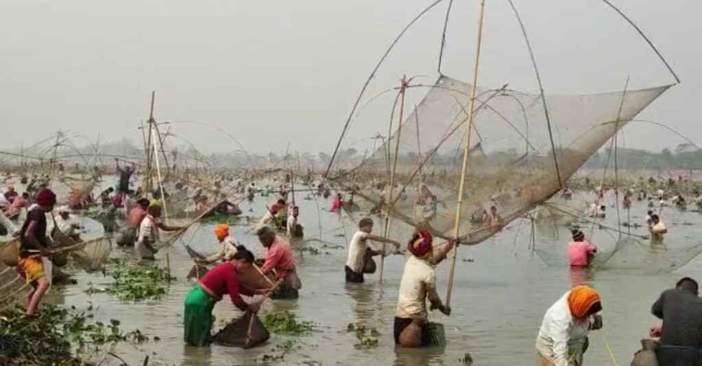 তিৱা ৰজা আৰু ডা- ডাঙৰীয়া সকলে পৰম্পৰাগত ৰীতি-নীতি মানি ঢাল, তৰোৱাল, আদি লৈ বিলৰ পাৰলৈ আহে । বিলৰ পাৰত ৰজাৰ পাৰিষদে স্বক্ৰীয় নীতি নিয়মেৰে বিলত পূজা দি পানী হিলৈ ফুটোৱাৰ পিছতে কেইবা হাজাৰ লোকে জাল, পল, জাকৈ লৈ সমূহীয়া মৎস্য চিকাৰত অংশগ্ৰহণ কৰি আনন্দ উপভোগ কৰে। ইপিনে মেলাস্থলীতে অনুষ্ঠিত হয় পৰম্পৰাগত কুঁকুৰা যুঁজ।পথাৰত কুকুৰাৰ মালিকে ঘূৰনীয়াকৈ বহি কুকুৰাৰ জোৰ মিলাই ভৰিত বিশেষ লোৰ জোঙা অস্ত্ৰ বান্ধি এৰি দিয়া মতা কুকুৰাই বিশেষ ভংগীত ওপৰলৈ জাপ মাৰি এটাই আনটোক জোঙা অস্ত্ৰৰে বুকুত আঘাট কৰিবলৈ যি প্ৰদ্ধতিৰে যুঁজ দিয়ে সেয়া চাবলগীয়া ।