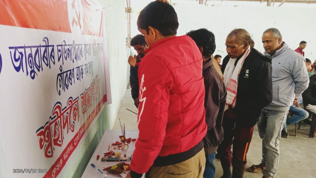 মঙলবাৰে বিহালী বৰগাঙত চাউলধোৱাৰ ১৫ গৰাকী শ্বহীদলৈ শ্ৰদ্ধাঞ্জলি অৰ্পণ কৰি সশ্ৰদ্ধ সোৱঁৰণ কৰে চিপিআই(এম-এল)ৰ বিশ্বনাথ জিলা সমিতিয়ে। দিনৰ ১১ বজাত শ্বহীদসকললৈ শ্ৰদ্ধাঞ্জলি জ্ঞাপন কৰাৰ পিছত এখন সভা অনুষ্ঠিত কৰা হয়। মিন আচাৰ্য্যৰ সভাপতিত্বত অনুষ্ঠিত হোৱা সভাখনত চিপিআই(এম-এল)ৰ ৰাজ্যিক সম্পাদক বিবেক দাস, জিলা সম্পাদক নাৰায়ণ পৌড়েল, ৰাজ্যিক সদস্য লীলা শৰ্মা,অনন্ত হাজৰিকা, বিশ্বনাথ জিলা সমিতিৰ সদস্য ক্ৰমে লক্ষীকান্ত কুৰ্মি,প্ৰাঞ্জল কুটুম,বাহাদুৰ কায়স্থ,মহেন্দ্ৰ লোহাৰ,কৃষ্ণ পাইক,বদন মুণ্ডা,উৰ্মিলা পাইক, কৃষ্ণ নাহৰি আদিৰ লগতে শতাধিক দলীয় কৰ্মী উপস্থিত থাকে।