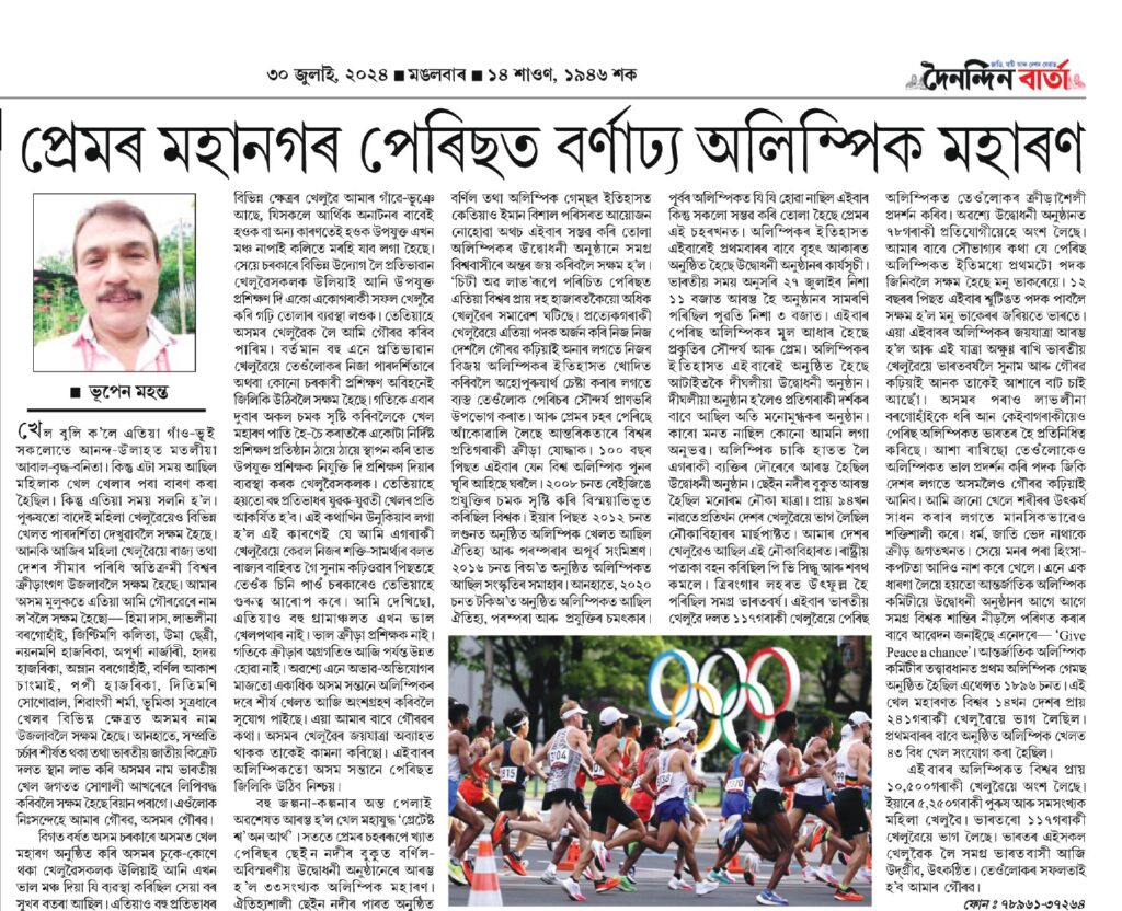 বিগত বৰ্ষত অসম চৰকাৰে অসমত খেল মহাৰণ অনুষ্ঠিত কৰি অসমৰ চুকে-কোণে থকা খেলুৱৈসকলক উলিয়াই আনি এখন ভাল মঞ্চ দিয়া যি ব্যৱস্থা কৰিছিল সেয়া বৰ সুখৰ বতৰা আছিল। এতিয়াও বহু প্ৰতিভাধৰ বিভিন্ন ক্ষেত্ৰৰ খেলুৱৈ আমাৰ গাঁৱে-ভূঞে আছে, যিসকলে আৰ্থিক অনাটনৰ বাবেই হওক বা অন্য কাৰণতেই হওক উপযুক্ত এখন মঞ্চ নাপাই কলিতে মৰহি যাব লগা হৈছে। সেয়ে চৰকাৰে বিভিন্ন উদ্যোগ লৈ প্ৰতিভাৱান খেলুৱৈসকলক উলিয়াই আনি উপযুক্ত প্ৰশিক্ষণ দি একো একোগৰাকী সফল খেলুৱৈ কৰি গঢ়ি তোলাৰ ব্যৱস্থা লওক। তেতিয়াহে অসমৰ খেলুৱৈক লৈ আমি গৌৰৱ কৰিব পাৰিম। বৰ্তমান যিসকল প্ৰতিভাৱান খেলুৱৈয়ে তেওঁলোকৰ নিজা পাৰদৰ্শিতাৰে অথবা কোনো চৰকাৰী প্ৰশিক্ষণ অবিহনেই জিলিকি উঠিবলৈ সক্ষম হৈছে। গতিকে এবাৰ দুবাৰ অকল চমক সৃষ্টি কৰিবলৈকে খেল মহাৰণ পাতি হৈ-চৈ কৰাতকৈ একোটা নিৰ্দিষ্ট প্ৰশিক্ষণ প্ৰতিষ্ঠান ঠায়ে ঠায়ে স্থাপন কৰি তাত উপযুক্ত প্ৰশিক্ষক নিযুক্তি দি প্ৰশিক্ষণ দিয়াৰ ব্যৱস্থা কৰক। এই কথাখিন উনুকিয়াব লগা হ”ল এই কাৰণেই যে আমি এগৰাকী খেলুৱৈয়ে কেৱল নিজৰ শক্তি-সামৰ্থ্য বলত ৰাজ্যৰ বাহিৰত গৈ সুনাম কঢ়িওৱাৰ পিছতহে তেওঁক চিনি পাওঁ। আমি ভাবো এতিয়াও গ্ৰামাঞ্চচলসমূহত এখন ভাল খেলপথাৰ নাই। ভাল ক্ৰীড়া প্ৰশিক্ষক নাই। গতিকে ক্ৰীড়াৰ অগ্ৰগতিও আজি পৰ্যন্ত উন্নত হোৱা নাই। অৱশ্যে এনে অভাৱ-অভিযোগৰ মাজতো অসম সন্তানে অলিম্পিকৰ দৰে খেলৰ শীৰ্ষ খেলত আজি অংশগ্ৰহণ কৰিবলৈ সুযোগ পাইছে। এয়া আমাৰ বাবে গৌৰৱৰ কথা। অসমৰ খেলুৱৈৰ জয়যাত্ৰা অব্যাহত থাকক তাকেই কামনা কৰিছো। এইবাৰৰ অলিম্পিকতো অসম সন্তানে পেৰিছত জিলিকি উঠিব নিশ্চয়।