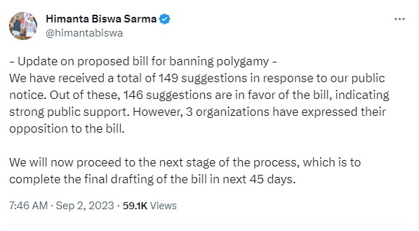 তিনিচুকীয়াত বিজেপিৰ মিত্ৰ দলসমূহৰ বৈঠকত ভাষণ দি মুখ্যমন্ত্ৰী শৰ্মাই কয়, “ৰাজ্য চৰকাৰৰ বহুবিবাহ নিষিদ্ধ কৰাৰ কৰ্তৃত্বৰ সম্ভাৱনীয়তা মূল্যায়নৰ বাবে এখন আইনী সমিতি গঠন কৰা হৈছিল আৰু এই ফ্ৰণ্টত আমি ইতিবাচক প্ৰতিক্ৰিয়া লাভ কৰিছো।”